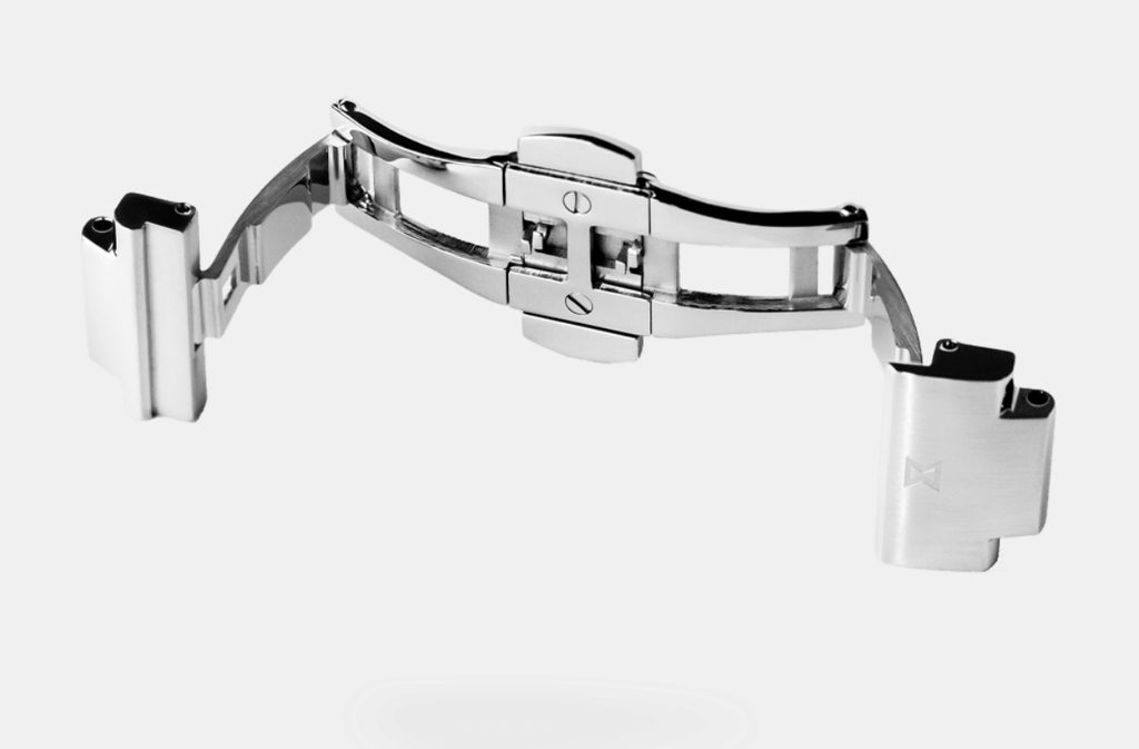 The watch case is made of stainless steel. The case is connected to the steel movement with a butterfly clasp. The blue dial is protected by a sapphire crystal, which is highly resistant to scratches.