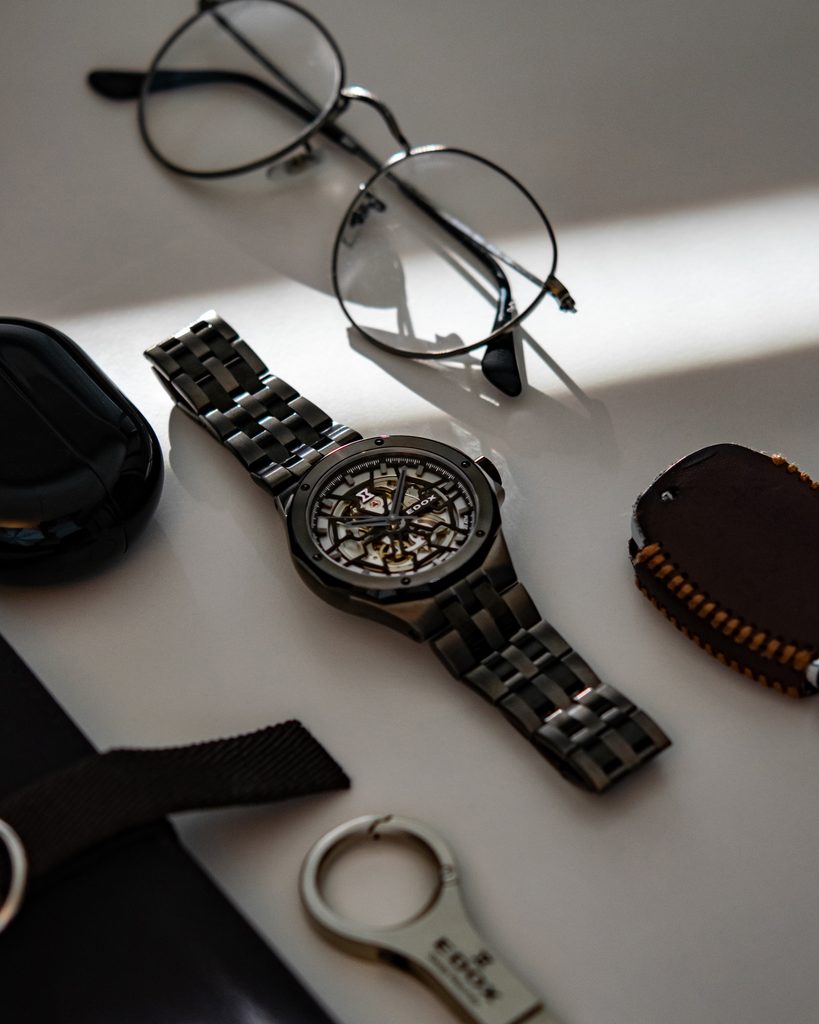 The watch case is made of high quality stainless steel in PVD grey finish, followed by a steel bracelet also with PVD finish in a combination of black and grey. The black skeleton dial is protected by a sapphire crystal that is resistant to any scratches. The watch is characterized by high water resistance up to 200 m, reliability, patented double screw crown seal. A distinctive feature of the watch is the blue skeleton dial, through which you can observe the work of the mechanical movement.