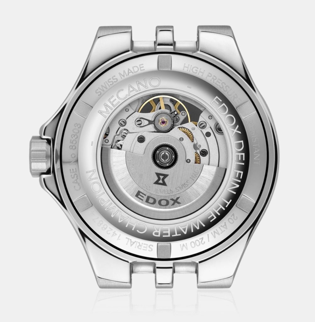 The EDOX Delfin Mecano Automatic 85303-3M-VNRO is powered by a Swiss mechanical movement with automatic winding Edox 853 (Sellita SW200). It is fitted with 26 jewels, operates at a frequency of 28,800 semi-beats per hour and the winding power reserve is a classic 42 hours. The machine also has a hacking function and the possibility of manual winding.