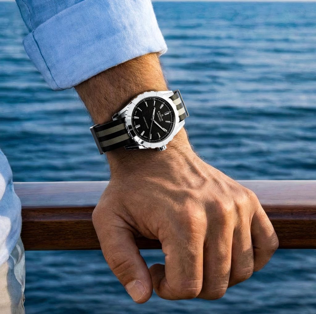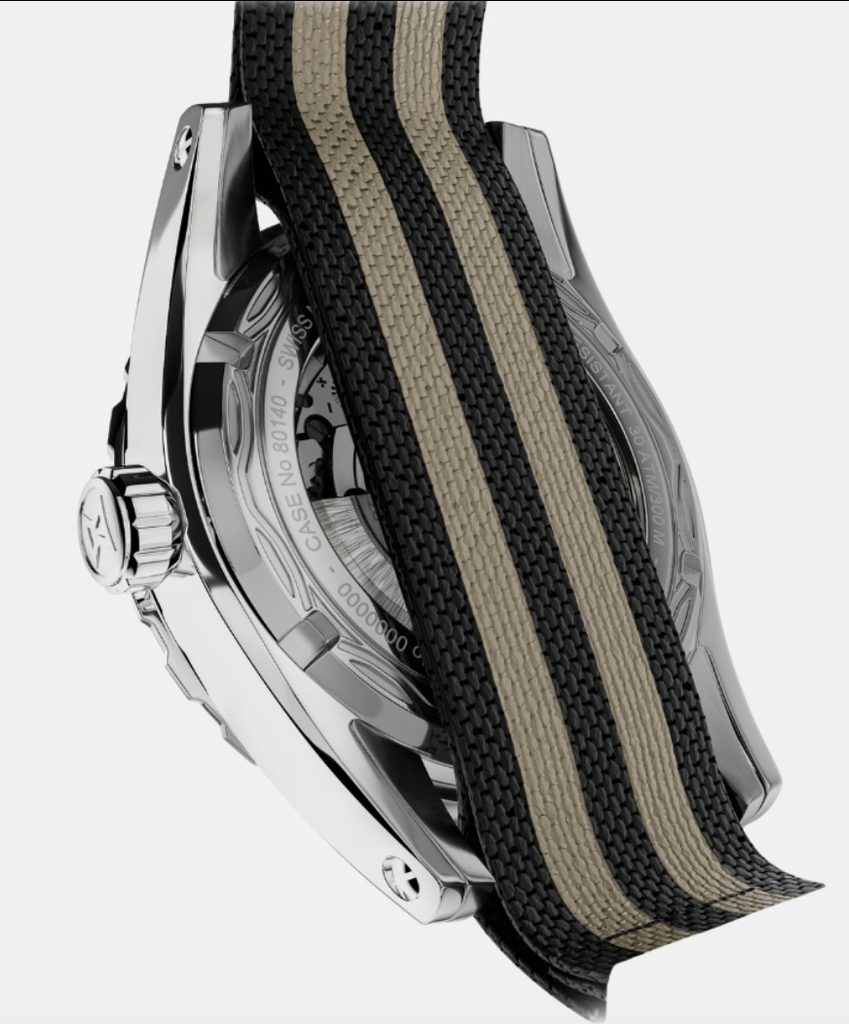 Precise operation of the model is ensured by a Swiss mechanical movement with automatic winding Sellita SW 200 with a power reserve of 38 h. Water resistance of the watch is 300 m (30 ATM) and is therefore suitable for both swimming and diving. The watch is equipped with a fabric strap that perfectly matches the design of the case.