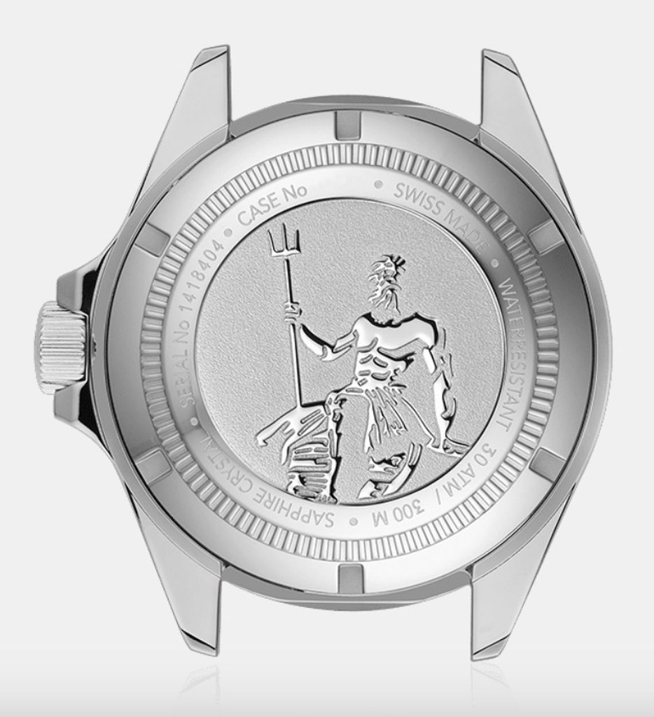 The watch face features the god of the sea, Neptune, with his iconic trident.