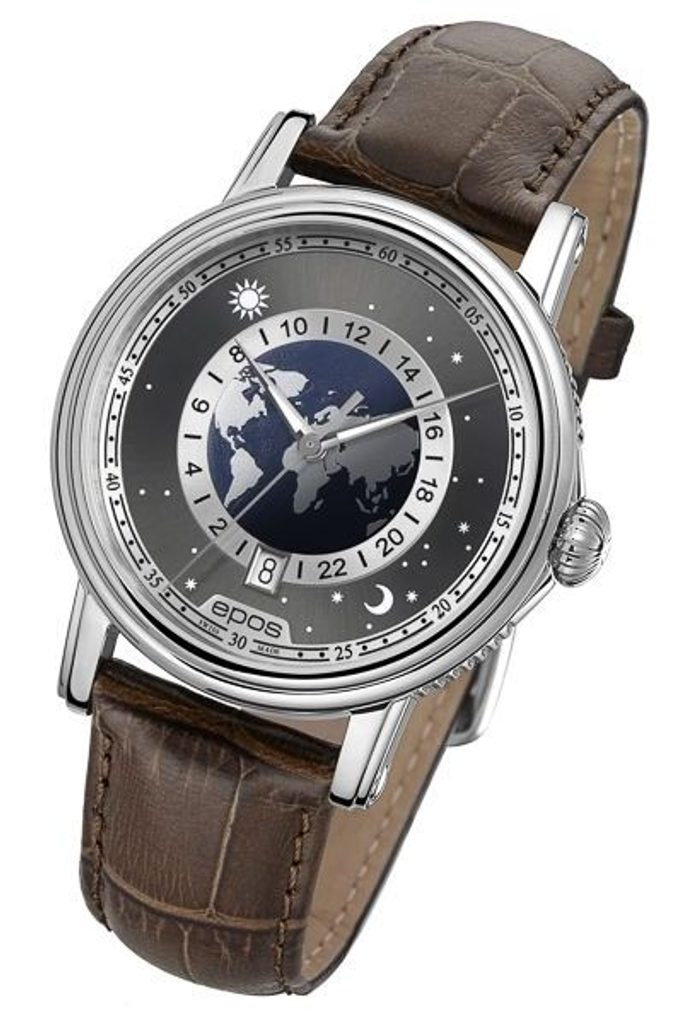 The highly elegant Epos Emotion 24H 3390.302.20.54.25 men's watch, based on the patented Epos 24-hour complication, features an elaborate 3D-printed globe at its centre, framed by a luminous sun, moon and stars that symbolise night and day.