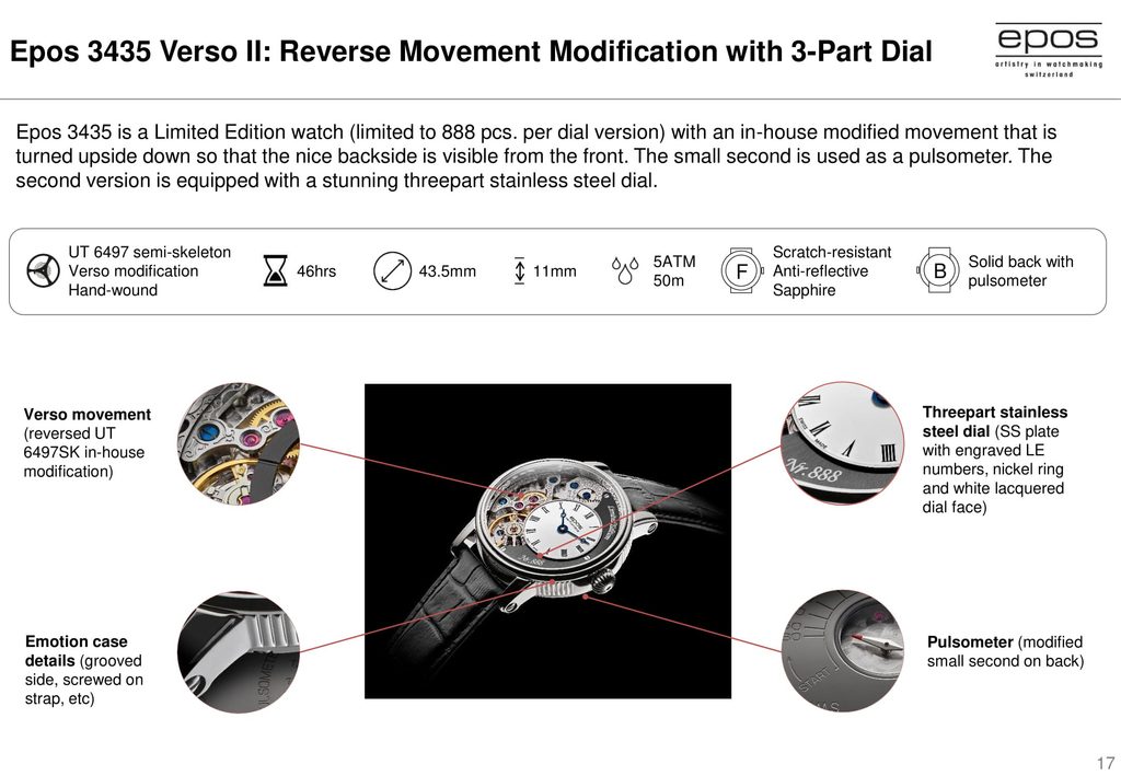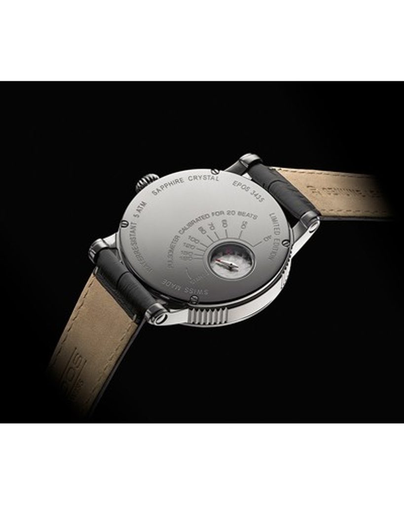 The Epos Oeuvre D'Art 3435.313.20.25.25 impresses with its design at first sight. The see-through dial, the atypically positioned sub-dial as a time display, or the visible serial number marking. All this is complemented by a heart rate monitor on the case back.