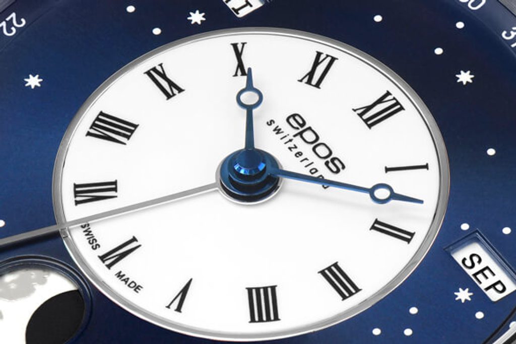The Epos Oeuvre D'Art V-Style 3439.322.20.26.25 features a moon phase or day-of-the-week indicator and even a display of the current calendar month. The large hand ending with a crescent moon points to the current calendar day along the inner lunette of the watch. Of course, the pure sapphire crystal has an anti-reflective coating.