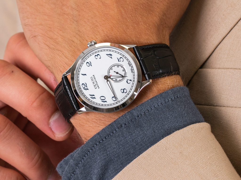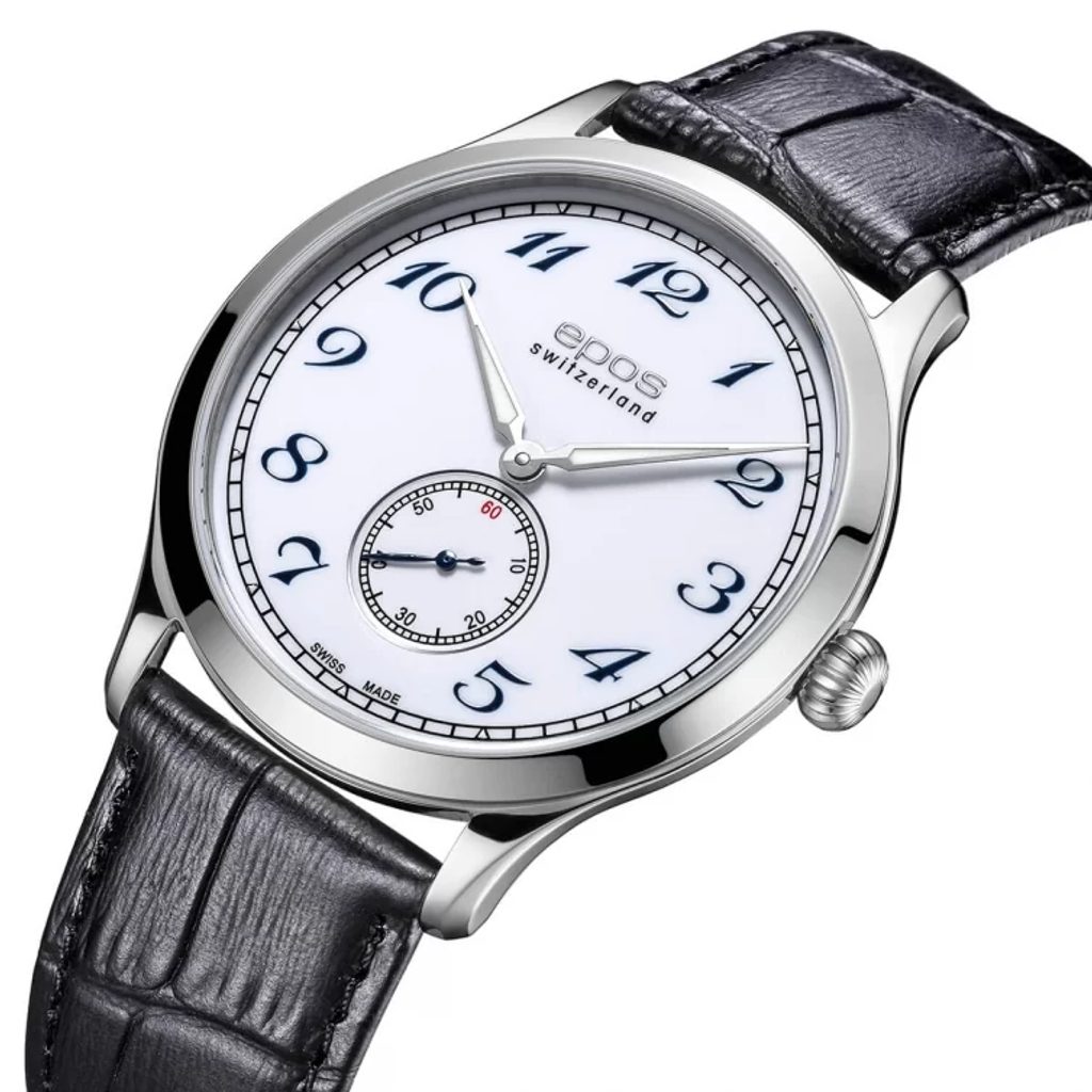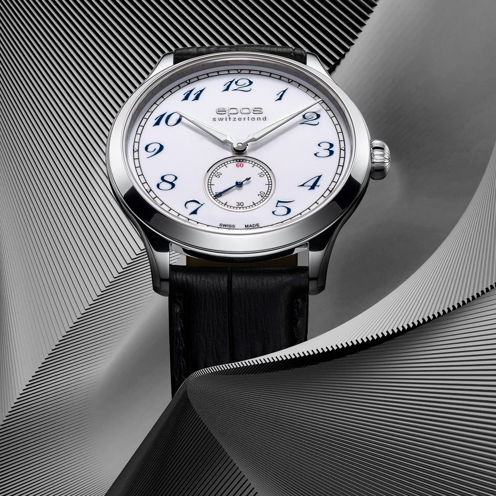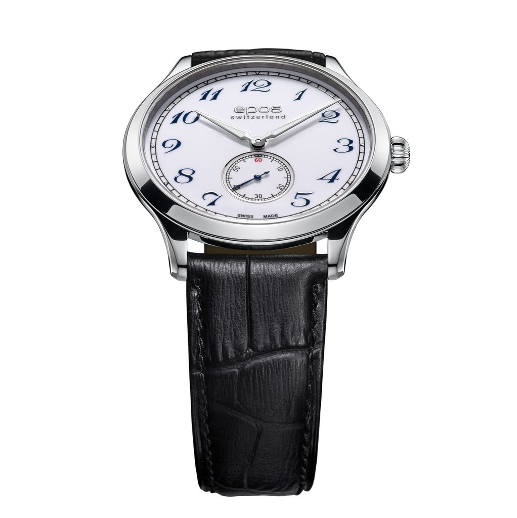 Epos Originale 3408.208.20.30.15 watch with a timeless, clearly designed dial dominated by an off-centre seconds hand at 6 o'clock.