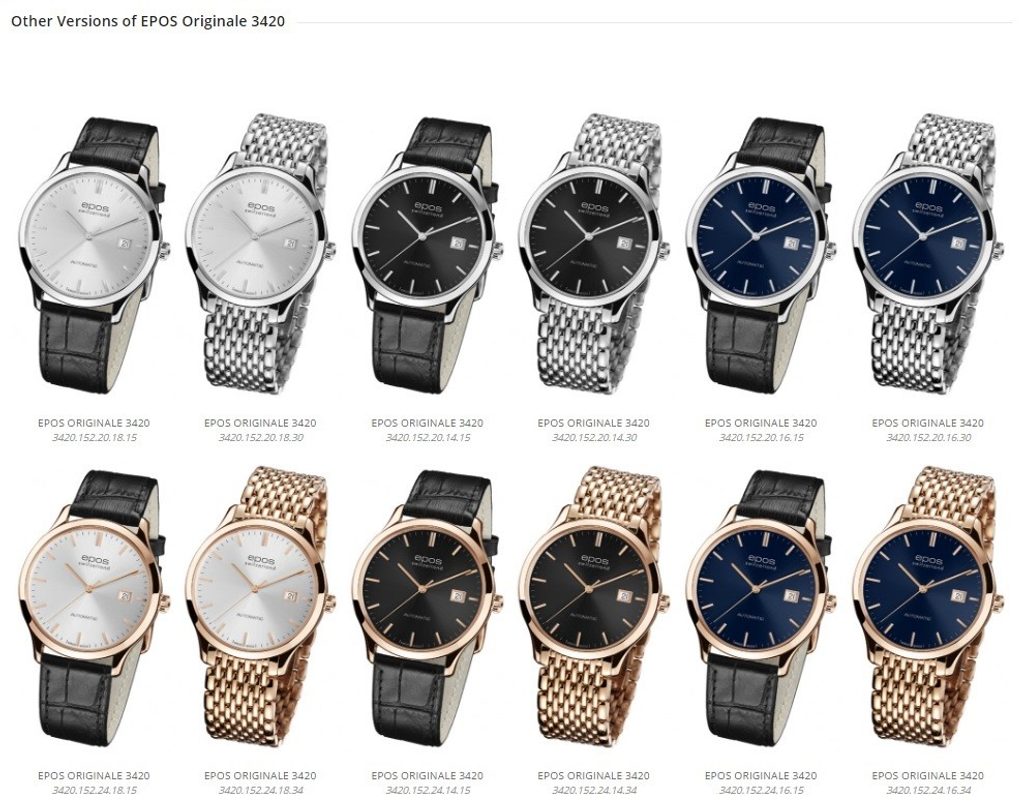 Epos Originale 3420.152.25.14.15 watch with a timeless, clearly designed dial dominated by a date display at 3 o'clock.