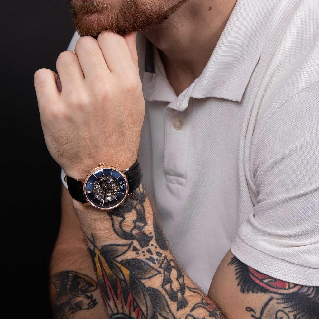 The elegant men's Epos Originale 3437.135.24.16.25 watch impresses at first glance with its transparent dial, through which you can see the precisely crafted skeletonized automatic movement Sellita SW200.