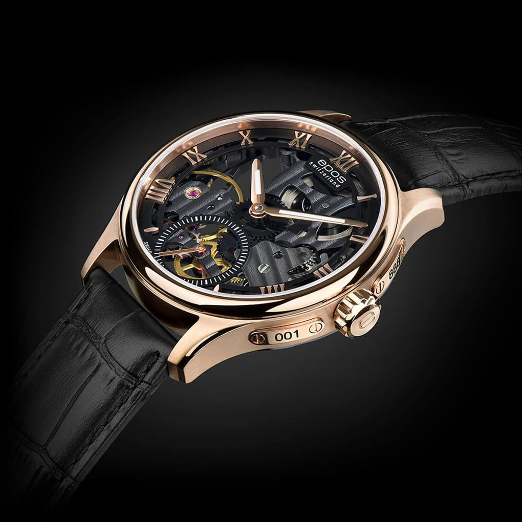 The Epos Originale SK Limited Edition 3500.169.24.25.25 features the Unitas 6498 mechanical Swiss movement with a power reserve of up to 46 hours and a purely manual winding. Its operation can be observed from both sides of the watch, thanks to the skeletonisation and transparent dial. For the first time ever, Epos used the Geneva stripes, or "Cotes de Genéve".