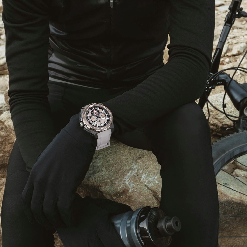 The 45.5mm case of the watch is made from 316L stainless steel for strength and durability, while the silicone strap offers a comfortable and flexible fit for any activity. Inside the case is a Miyota M0S20 quartz movement with a running accuracy of ±20 sec per month, allowing for accurate timekeeping.