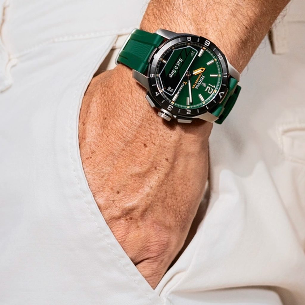 The watch is protected by a sapphire crystal with exceptional resistance to scratches and other mechanical damage. The model is complemented by a supple silicone strap in the colour of the dial with a width of 22.8 mm and a classic steel-coloured buckle clasp.