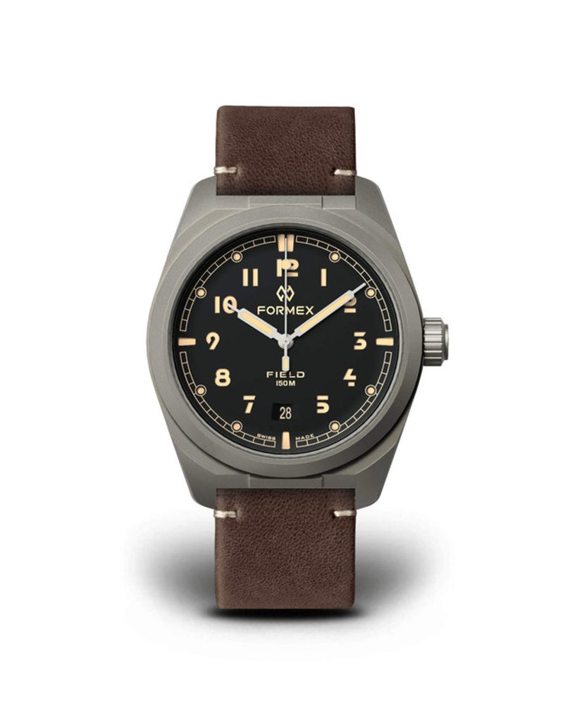 The classic hallmarks of the military-inspired Formex Field Automatic Charcoal include the distinctive and easy-to-read syringe-shaped hands and numerals at the hour positions, the easy-to-handle crown, higher water resistance, and screw-down case. The perfectly clear one-piece sandwich dial is protected by a sapphire crystal with internal anti-reflective coating and high scratch resistance. Improved legibility in low-light conditions is ensured by luminescence (Old Radium Super-LumiNova) on the hands, numerals and indices. Recessed numerals and hour indexes add visible depth to the dial. Everything is accentuated by the sensitively designed date indicator at the 6 o'clock position, with a wreath in the colour of the dial. What you'll appreciate most about this watch is its versatility; its set of features makes it ideal for use in sports, in the water, and for everyday use.
