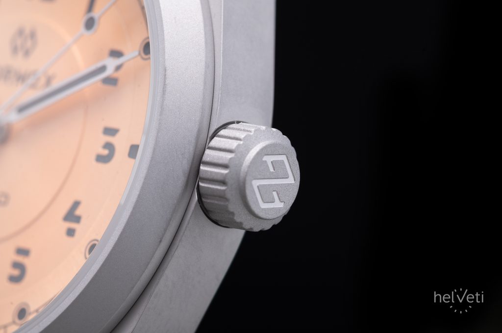 The case of the Formex Field Automatic Gen 2 Coho Salmon is made of grade 2 titanium and for increased durability, it is equipped with a special hardening, increasing the surface hardness from 145 Vickers to approximately 900 Vickers. All this while maintaining the light weight, high comfort and hypoallergenic properties of titanium. The case is complemented by a very comfortable green nylon velcro strap, finished with a velcro closure.