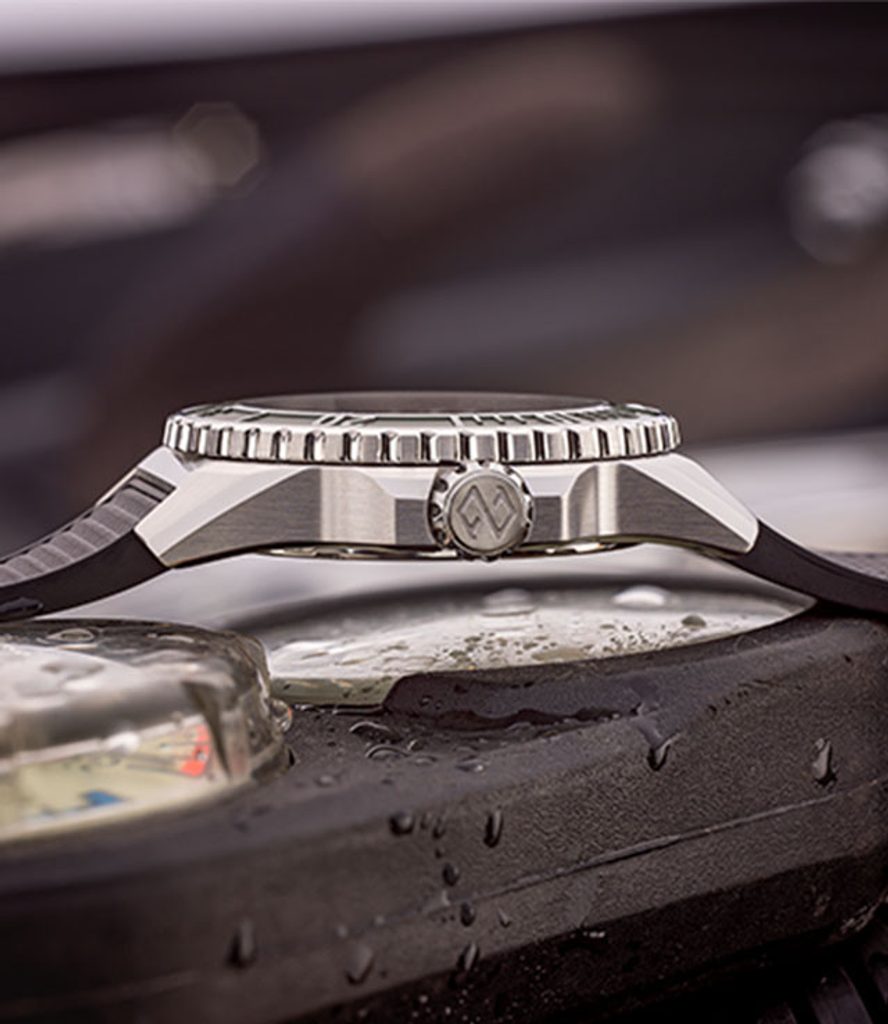 The basic case is complemented by a black rubber strap finished with a folding buckle with an innovative fine micro-adjustment system up to 7 mm. However, the strap can optionally be changed to a nylon/leather strap or a steel bracelet finished with a fold-over clasp with fine micro-adjustment and a length adjustment of up to 10 mm. Both the straps and the bracelet are equipped with a quick-release system, making it very easy to change without tools.