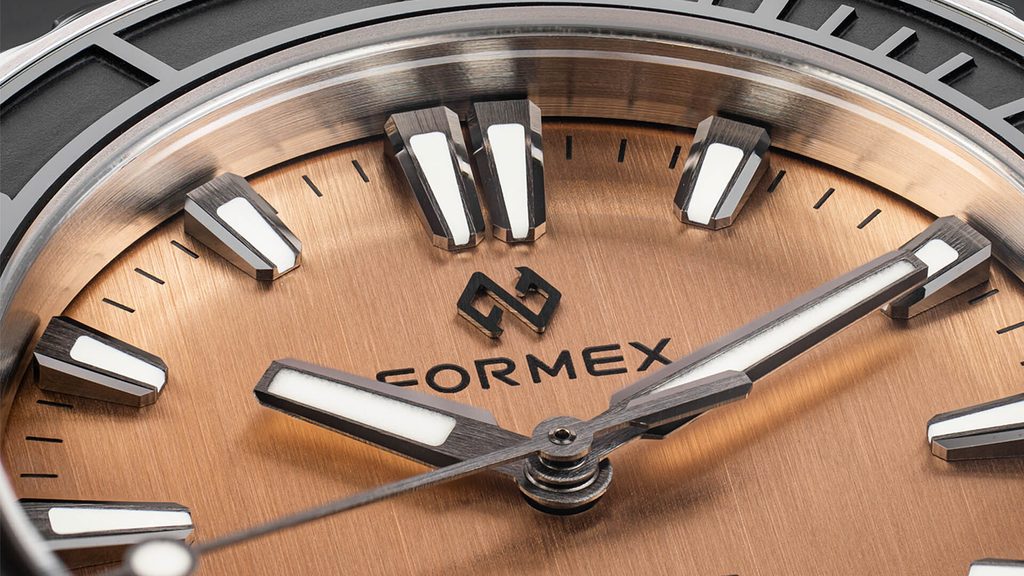 Bronze has often been used as a material for cases, but is rarely found as a material used for the manufacture of dials. The development of the bronze dial is the result of months of experimentation and prototyping by Formex. The result is a uniquely luminous dial that changes its form depending on the incident light. To prevent oxidation, the dial surface is treated with a lacquer.