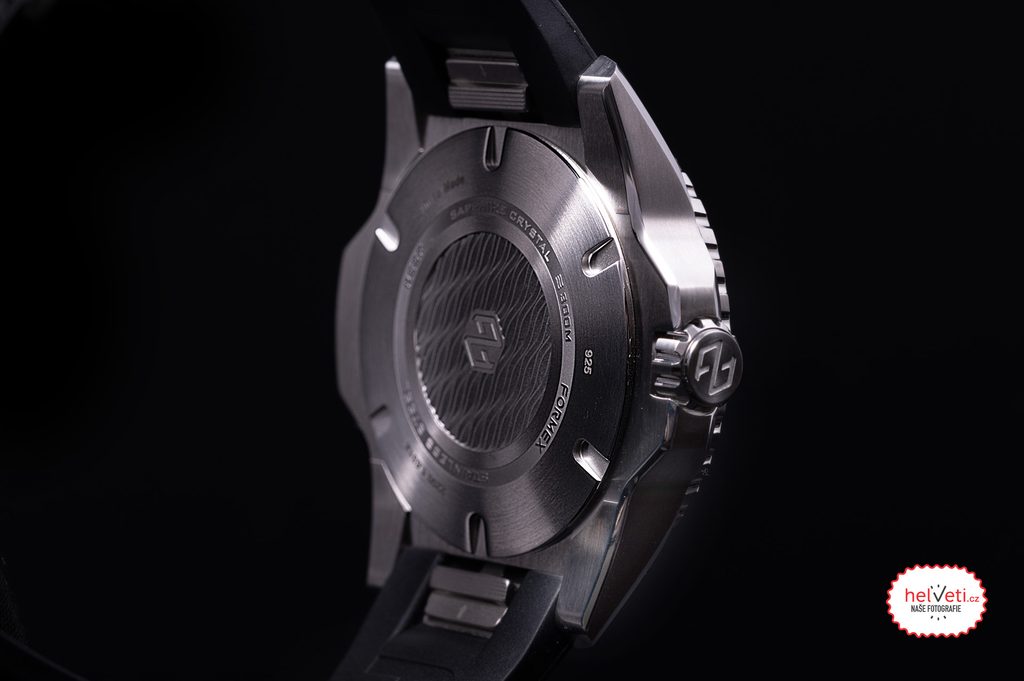 The case is complemented by a black rubber strap, finished with a fold-over buckle with an innovative fine micro-adjustment system in a range of up to 7 mm. The strap is equipped with a quick-release system, making replacement very easy even without tools.