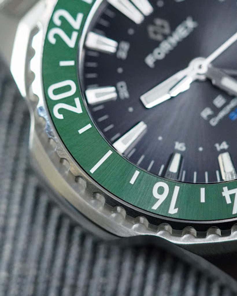 The case of the Formex Reef GMT Automatic Chronometer is made of steel with a brushed finish, complemented by fancy polished surfaces. The case is dominated by a bi-directional rotating bezel with ceramic insert and 24-hour time markers. The 48-handle lunette can be easily replaced without the need for any tools, allowing you to adapt the look of the watch to your current mood. Despite its robust appearance, the case reaches a height of just 11.4 mm (feeling more like 9.5 mm).