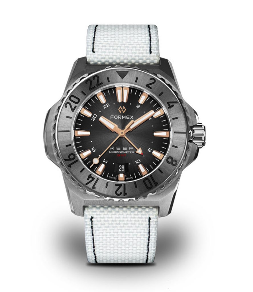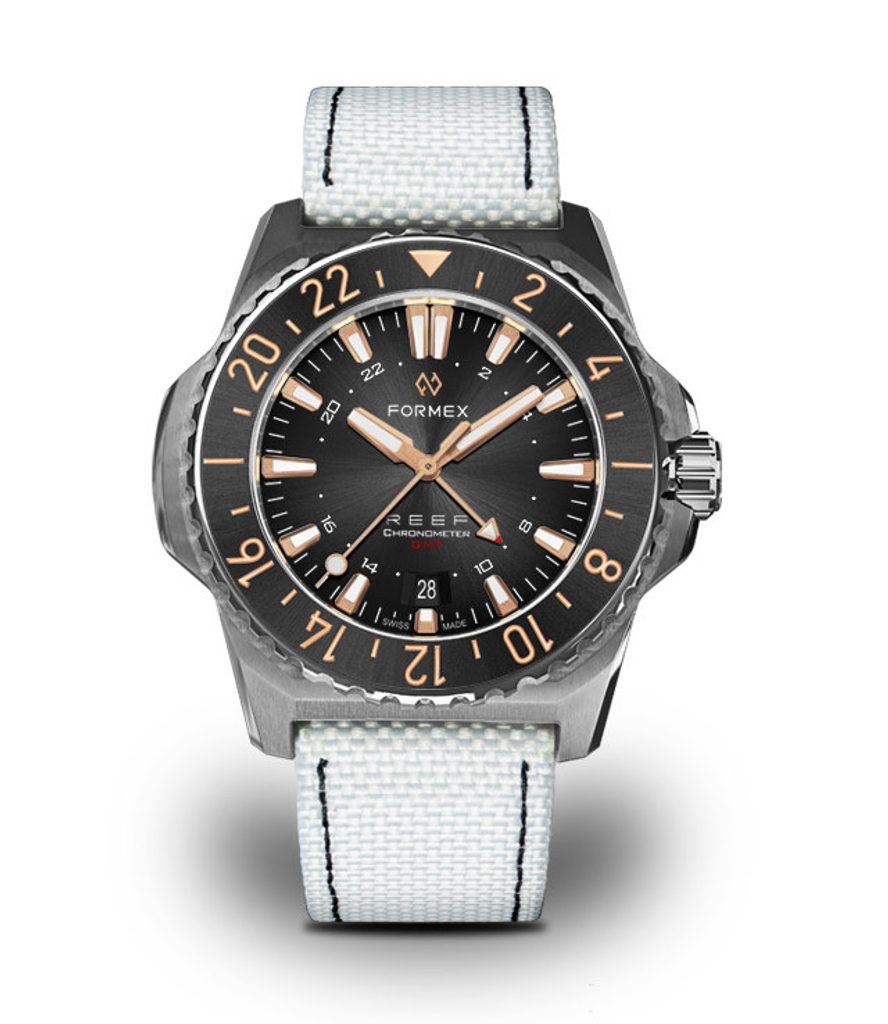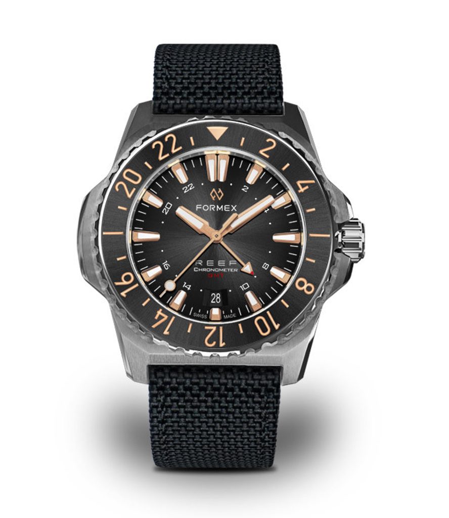 The Swiss diving watch Formex Reef GMT Automatic Chronometer Black Dial with Rose Gold impresses at first glance with its distinctive, clearly recognizable case and perfectly legible dial. It is a modern take on a dive watch suitable for any occasion, featuring simple lines, high durability and great clarity.