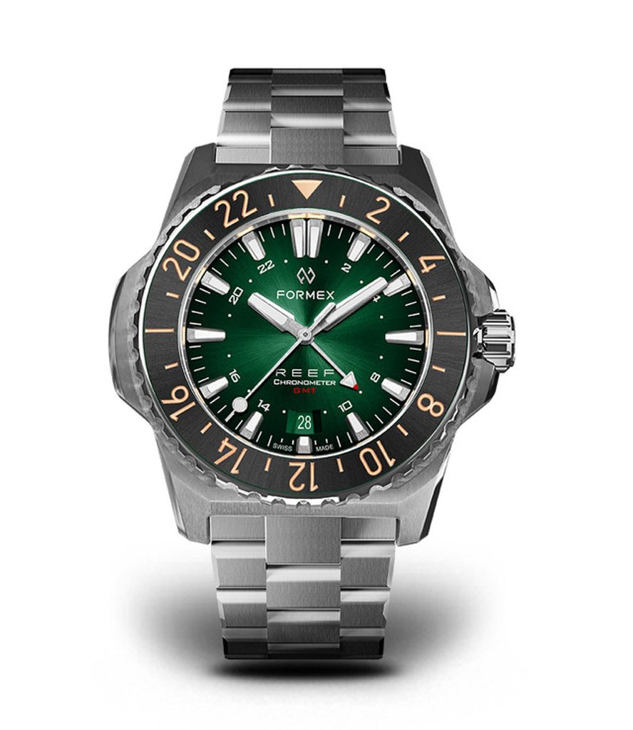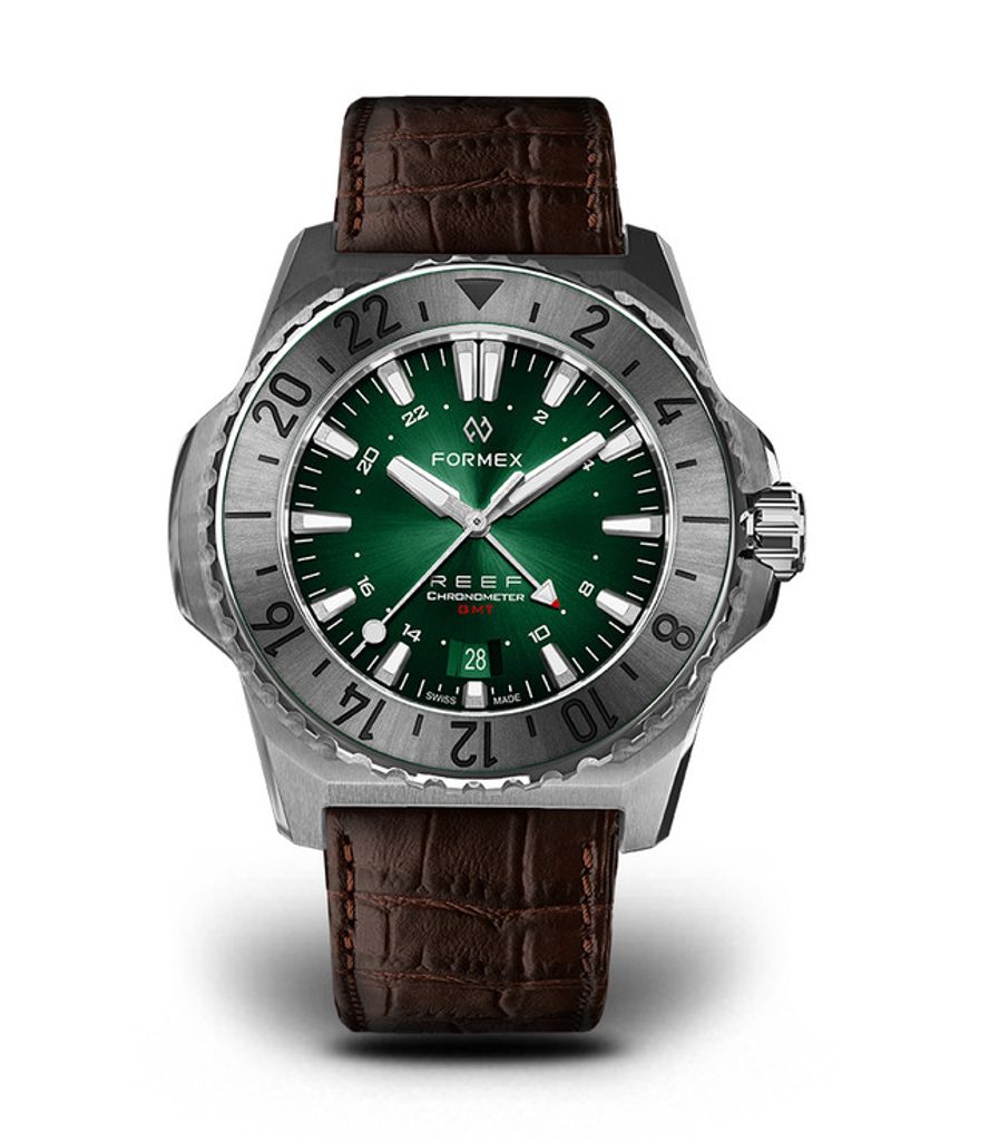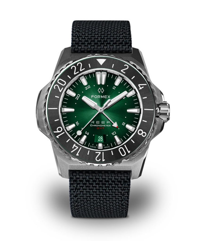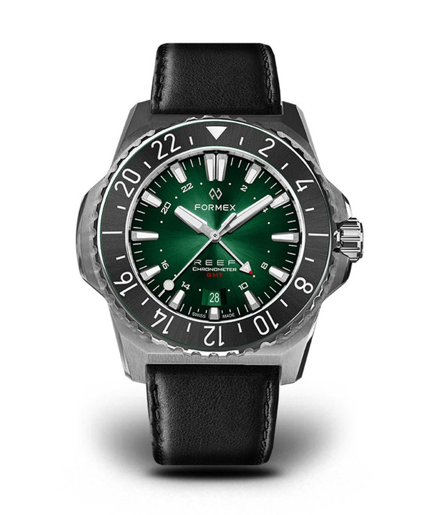 The Swiss diving watch Formex Reef GMT Automatic Chronometer Green Dial with Red GMT impresses at first glance with its distinctive, clearly recognizable case and perfectly legible dial. It is a modern take on a dive watch suitable for any occasion, featuring simple lines, high durability and great clarity.