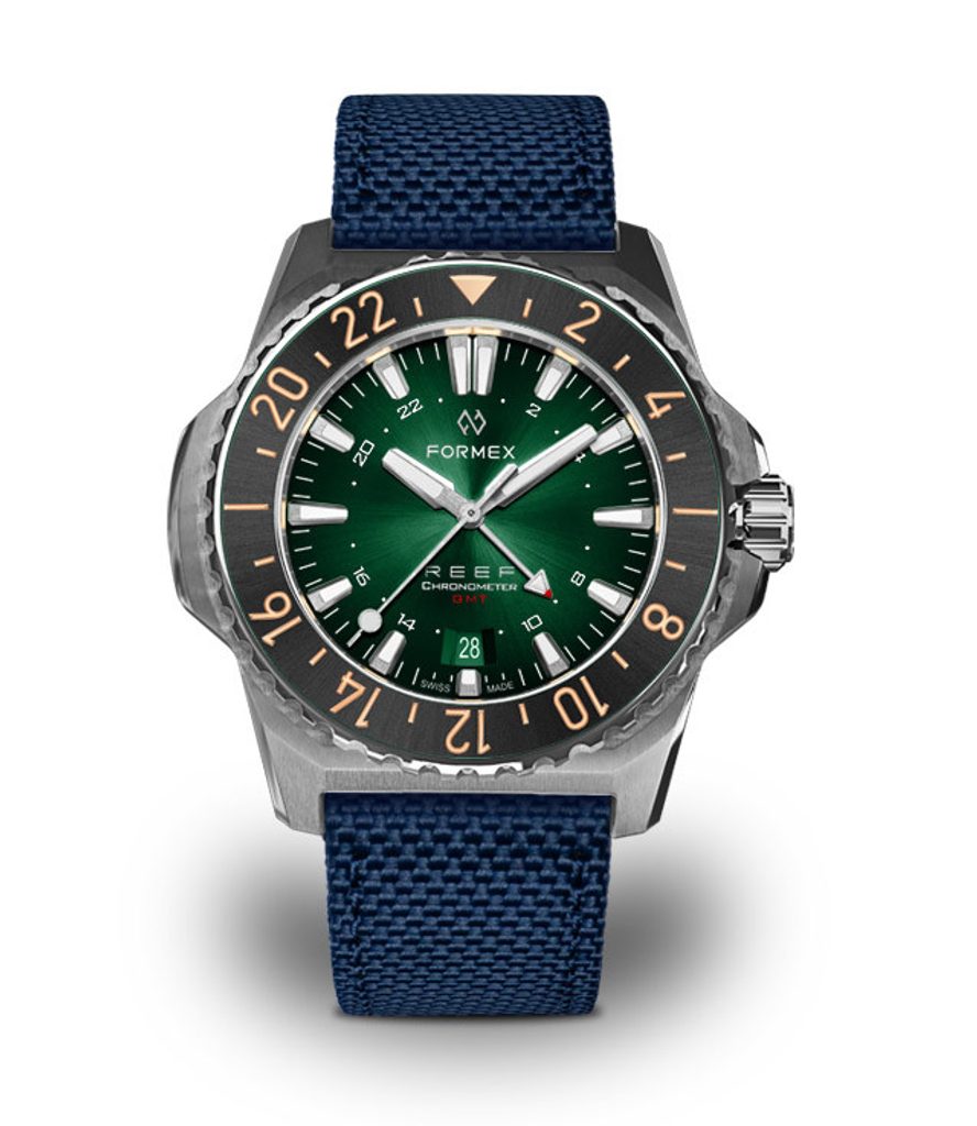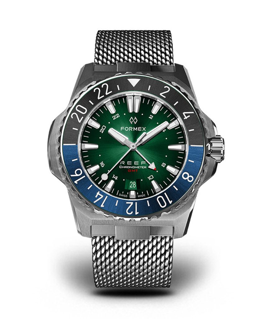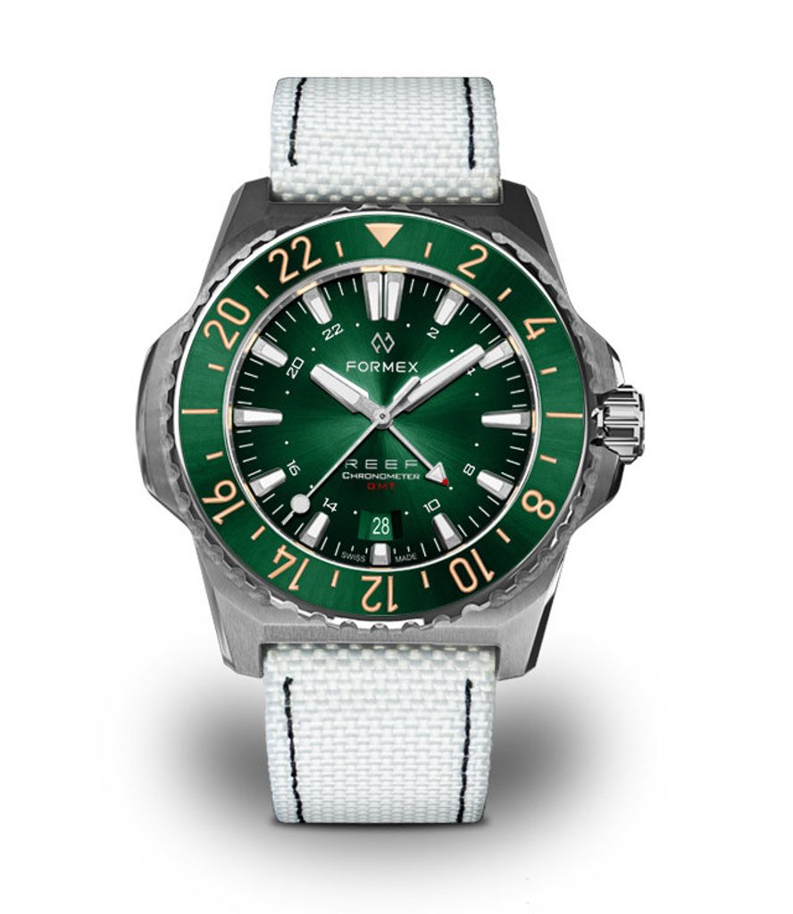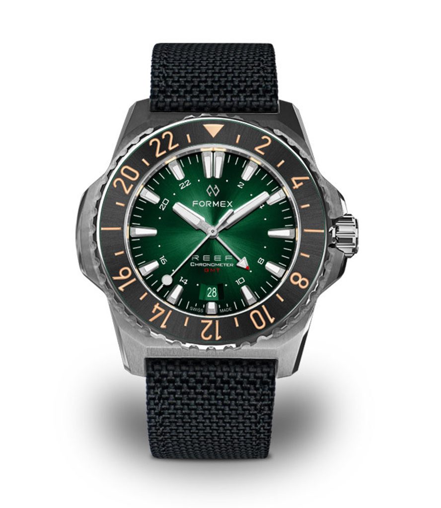 The Swiss diving watch Formex Reef GMT Automatic Chronometer Green Dial with Red GMT impresses at first glance with its distinctive, clearly recognizable case and perfectly legible dial. It is a modern take on a dive watch suitable for any occasion, featuring simple lines, high durability and great clarity.