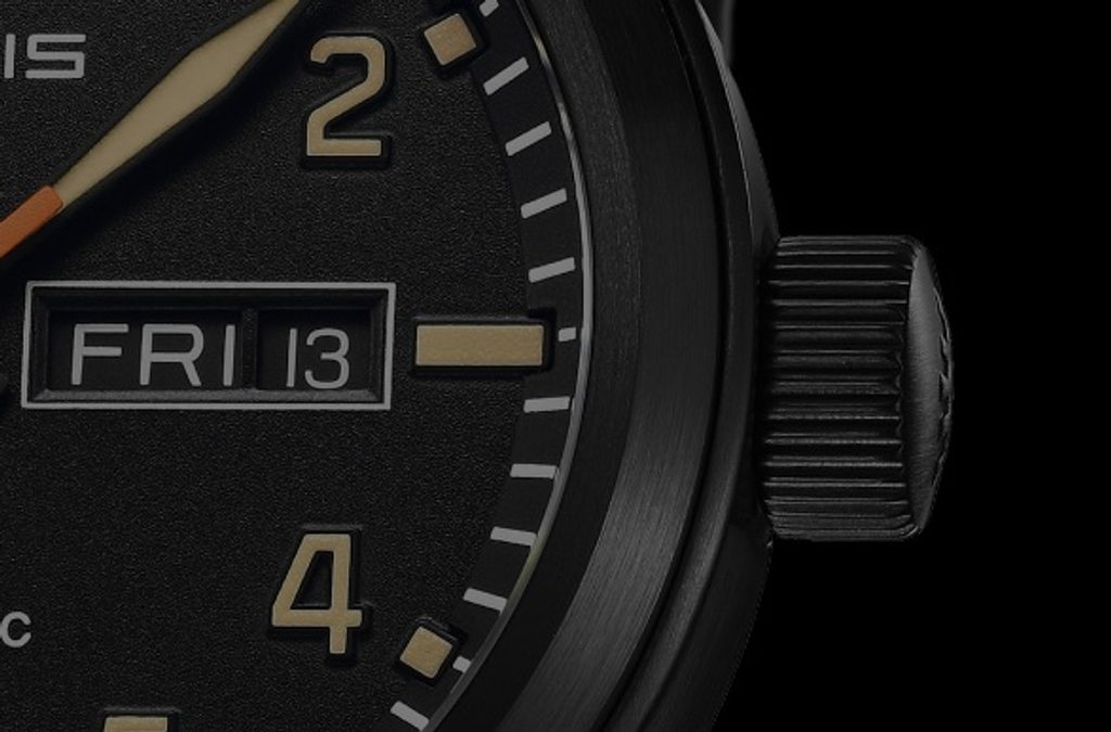The Fortis Aeromaster Stealth F4020007 has a case made of stainless steel with PVD finish, which is complemented by a nylon Cordura strap. A Swiss ETA 2836-2 mechanical movement with automatic winding works reliably in the case. It runs at a frequency of 28,800 semi-frequencies per hour and features 25 jewels. The machine also has a "hacking" function (stopping the second hand when ordered) and the possibility of manual winding with the crown. Its operation can be monitored thanks to a transparent dial. At the 3 o'clock position we find a practical date and day of the week indicator.