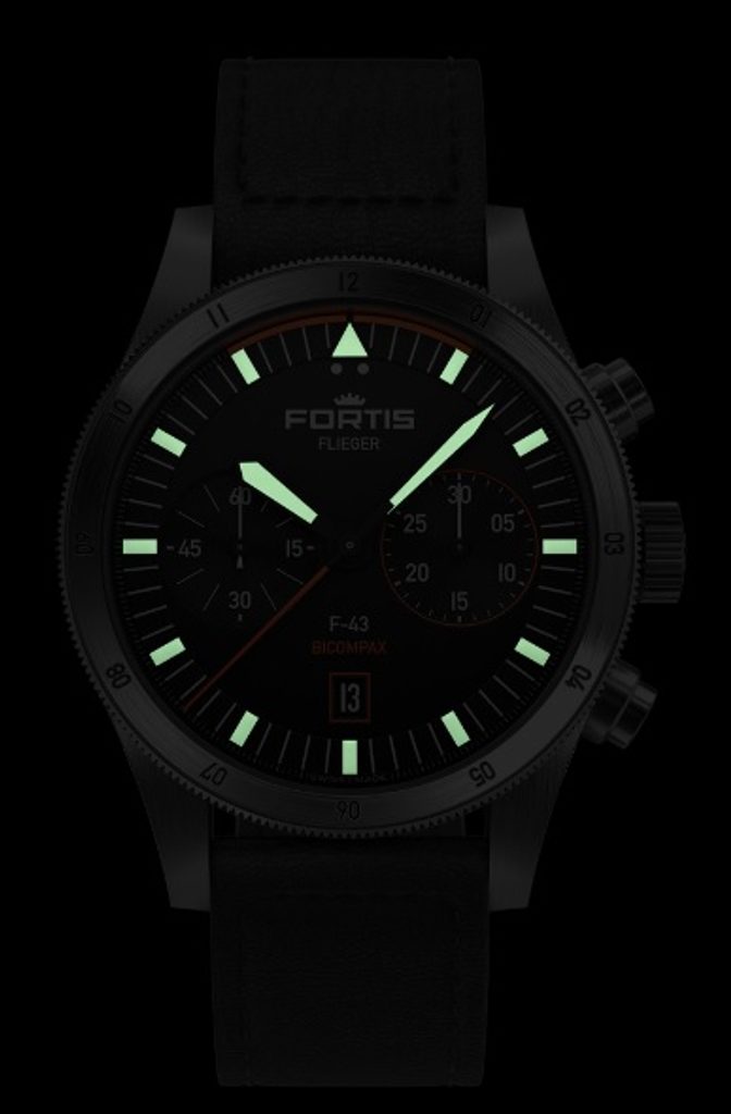 The Swiss Fortis Flieger F-43 Bicompax F4240005 watch impresses at first glance with its typical pilot's design with a clear Fortis signature. It is decorated with perfect clarity, robustness and durability. This watch will serve you well not only in the cockpit of an aircraft, but also in everyday wear.