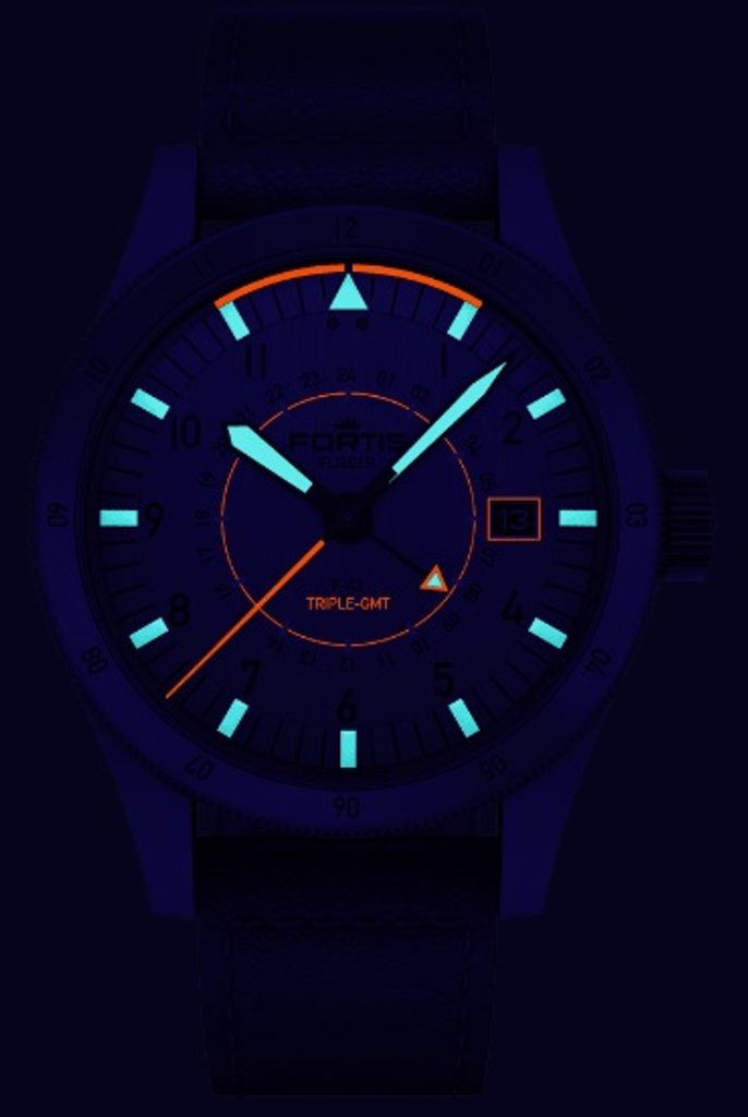 The Fortis Flieger F-43 Triple-GMT Titanium Orange COSC F4260003 has a case made of titanium, which is complemented by a leather strap. The Swiss mechanical manufacture movement Fortis WERK 13 (made for Fortis by Kenissi) with automatic winding works reliably in the case. It runs at a frequency of 28,800 semi-frequencies per hour and features 28 jewels and, above all, an extended power reserve of 70 hours. The machine also has a "hacking" function (stopping the second hand when ordered) and the possibility of manual crown winding. Travellers in particular will appreciate the GMT function - that is, the second time zone indicator in the form of a fourth hand. Moreover, this is the so-called True GMT, where the GMT hand moves with the time setting and the setting of the main hour hand then takes place in leaps of one hour, while the home time on the GMT hand remains unchanged. The reversible GMT lunette allows the time to be read in an extra time zone. At the 3 o'clock position we find a handy date display.
