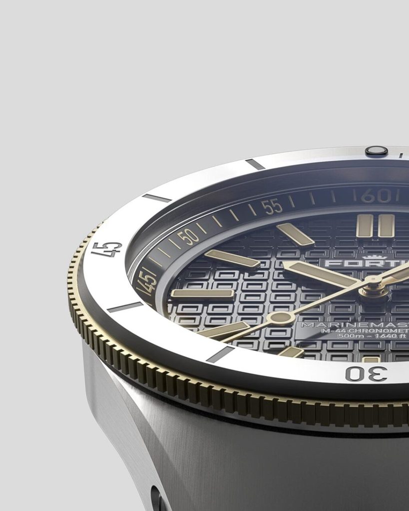The Fortis Marinemaster M-44 Black Resin Gold COSC Limited Edition F8120015 has a case made of recycled stainless steel, which is complemented by a flexible rubber strap. The case reliably houses a Swiss mechanical manufacture movement, the Fortis WERK 11 (made for Fortis by Kenissi) with automatic winding. It runs at a frequency of 28,800 semi-frequencies per hour and features 26 jewels and, above all, an extended power reserve of 70 hours. The machine also has a "hacking" function (stopping the second hand when ordered) and the possibility of manual crown winding. At the 3 o'clock position we find a practical date display. The bi-directionally rotatable diving lunette with the possibility of locking by the "Fortis Lock System®" (at the 10 o'clock position) allows the measurement of time periods. This lunette is made of recycled stainless steel combined with 18k gold.