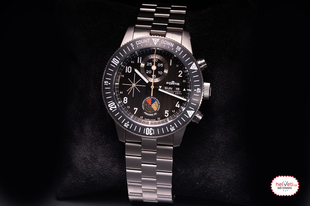 The Fortis Novonaut N-42 Amadee-24 Limited Edition F2040016 watch has a case made of titanium, complete with a tension movement made of the same material. Fine adjustment of the bracelet length without the use of tools is made possible by a sliding mechanism on the clasp. A special black elastic nylon strap is also included . In the case, the Manufacture Swiss mechanical movement Fortis WERK 17 (made for Fortis in cooperation with the Manufacture La Joux-Perret) with automatic winding works reliably. It runs at a frequency of 28,800 semi-frequencies per hour, has 26 jewels and an extended power reserve of 60 hours. The stopwatch function can be used with a minute counter at 12 o'clock and an hour counter at 6 o'clock. The movement also has a "hacking" function (stopping the second hand when ordered) and the possibility of manual winding by the crown. At the 3 o'clock position we find a handy date and day of the week display. A bidirectionally rotating ceramic lunette, which is adapted for timekeeping, is used to measure time periods. Another interesting feature is the MCB™ (Mission Control Bezel) system - two additional lumi-dot hands on the lunette, spaced 10 minutes apart. In fact, the time delay in communication between Mars and Earth is just 10 minutes, so astronauts can track how long it will take for the next communication from ground control by simply turning the lunette.
