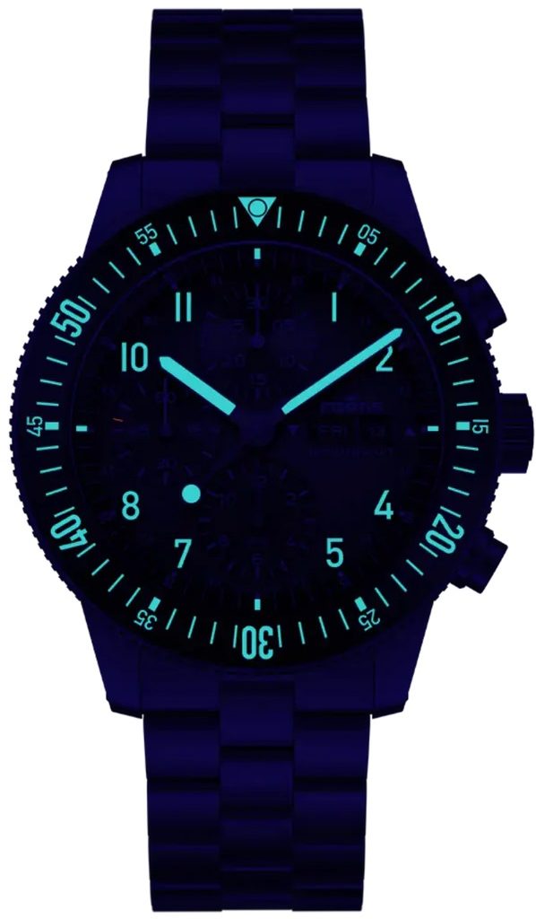 The Fortis Novonaut N-42 Titanium Legacy Edition F2040017 has a case made of titanium, complete with a strain made of the same material. Fine adjustment of the bracelet length without the use of tools is made possible by a sliding mechanism on the clasp, a significant improvement over its predecessor. The Manufacture Swiss mechanical movement Fortis WERK 17 (made for Fortis in cooperation with the Manufacture La Joux-Perret) with automatic winding works reliably in the case. It runs at a frequency of 28,800 semi-frequencies per hour, has 26 jewels and an extended power reserve of 60 hours. The stopwatch function can be used with a minute counter at 12 o'clock and an hour counter at 6 o'clock. The movement also has a "hacking" function (stopping the second hand when ordered) and the possibility of manual winding by the crown. At the 3 o'clock position we find a handy date and day of the week display. A bidirectionally rotating ceramic lunette is used to measure time periods.