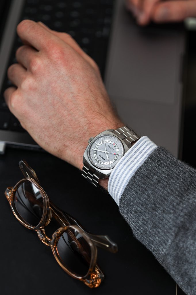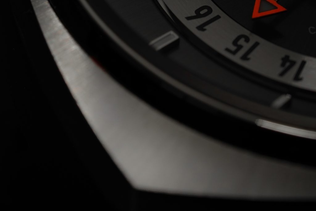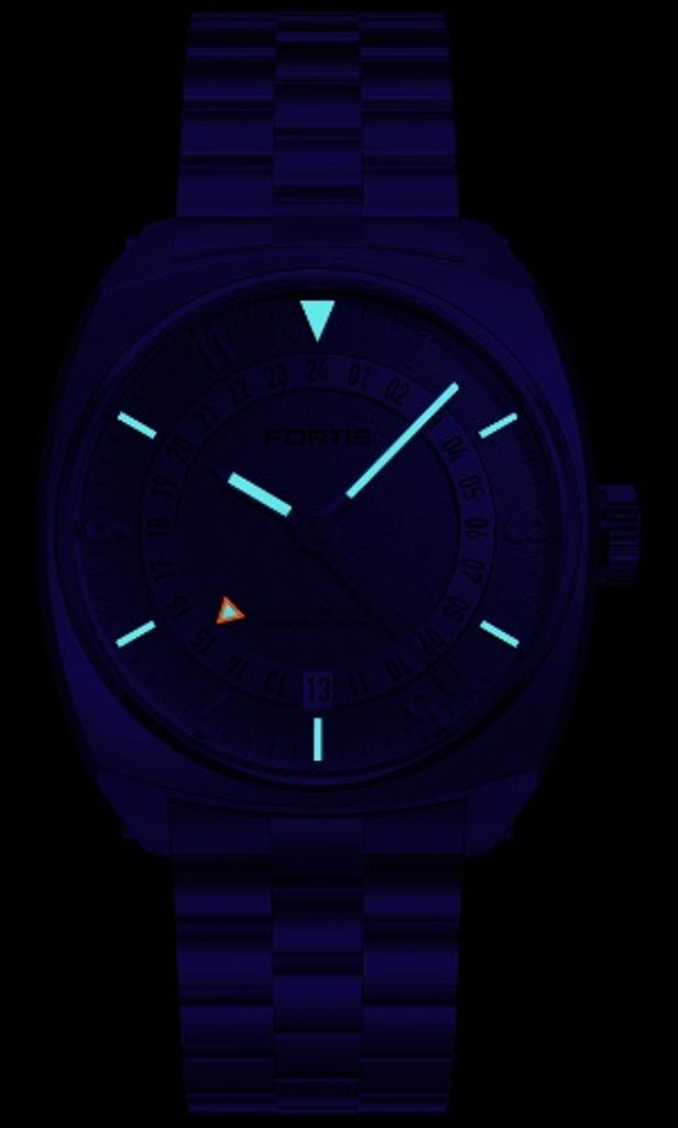 The perfectly clear dial is protected by a sapphire crystal that is maximally scratch resistant. The double-sided anti-reflective coating ensures excellent legibility even in direct sunlight. The SuperLuminova luminescence on the hands and indexes enables readability in darkness and low-light conditions. Under UV light, the GMT hands are even more visible. The water resistance of this model is 200m, so it can handle even greater contact with water, such as swimming or diving to about 20m. The water resistance is supported by a screw-down crown with a triple gasket system (FKM Triple-Gasket System).
