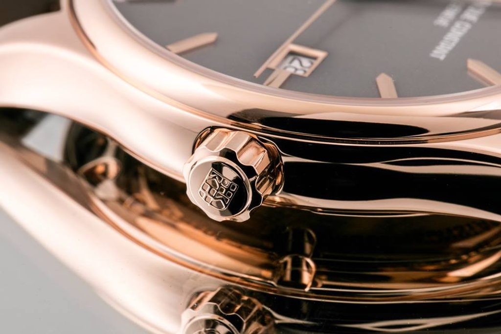 The case of the Frederique Constant FC-303LGR5B4 is made of stainless steel with a rose gold PVD finish and is complemented by a leather strap. Inside the case, the FC-303 Swiss mechanical movement (based on the Sellita SW200) with automatic winding works reliably. It operates at a frequency of 28,800 semi-frequencies per hour and features 26 jewels. At the traditional position of the third hour we find a practical date display.