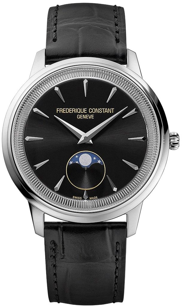 The case of the Frederique Constant FC-206B3S6 is made of stainless steel and is complemented by a leather strap. Inside the case, the FC-206 Swiss battery-powered movement (based on the Ronda 706) with five jewels works reliably. It has a moon phase indicator function at the six o'clock position.