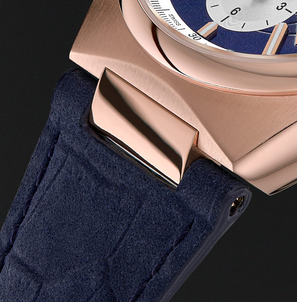 The case of the Frederique Constant FC-391NS4NH4 is made of stainless steel with a rose gold PVD finish and is complemented by a leather strap. An extra rubber strap is also included. The straps have quick-release buckles and can therefore be changed quickly and easily without the use of tools. Inside the case, the FC-391 Swiss mechanical movement (based on the La Joux-Perret Chronographe Manufacture L100) with automatic winding works reliably. It operates at a frequency of 28,800 semi-frequencies per hour and has 26 jewels. This movement has a chronograph function, i.e. a stopwatch. The large central seconds hand serves as the stopwatch, the sub-dial at the 9 o'clock position houses the minute counter, while the sub-dial at the 6 o'clock position serves as the hour counter. Also worth mentioning is the extended power reserve of 60 hours. The movement's operation can be observed through a transparent escapement. At position 4-5 we find a practical date display.