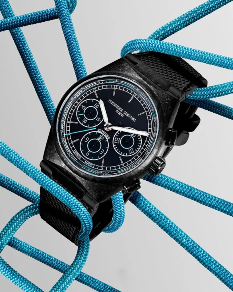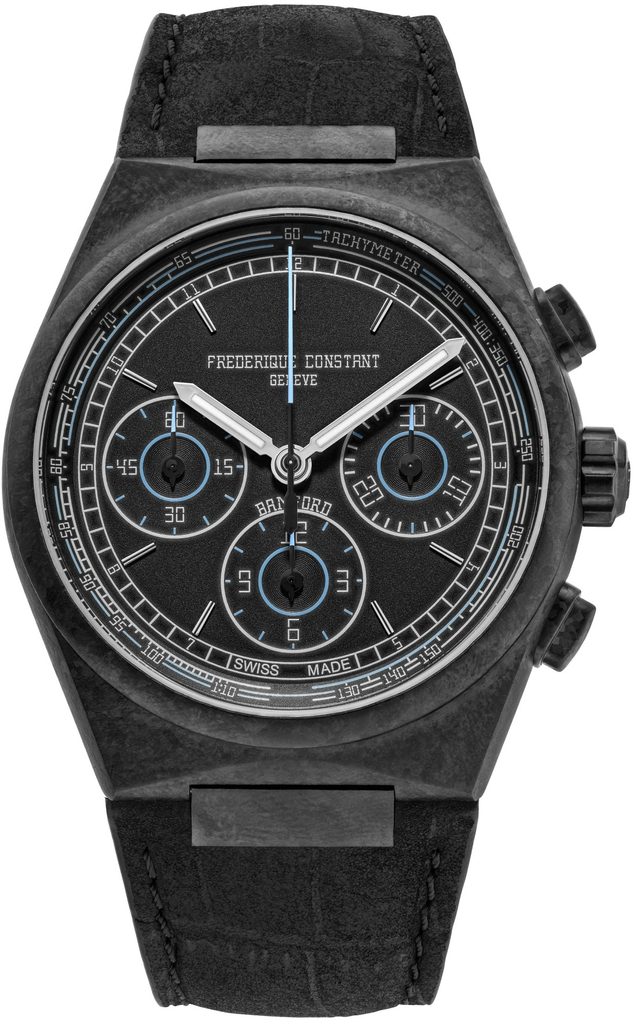 Bamford Watch Department is a British company that specializes in customizing luxury watches. Founded in 2009, they are not afraid to shake up the watch world by modifying iconic models with an emphasis on black. For this model, in addition to the unique case, a matte black dial with turquoise elements on the hands and counters was created, which increases the level of legibility. This is Frederique Constant' s first collaboration with the Bamford Watch Department.