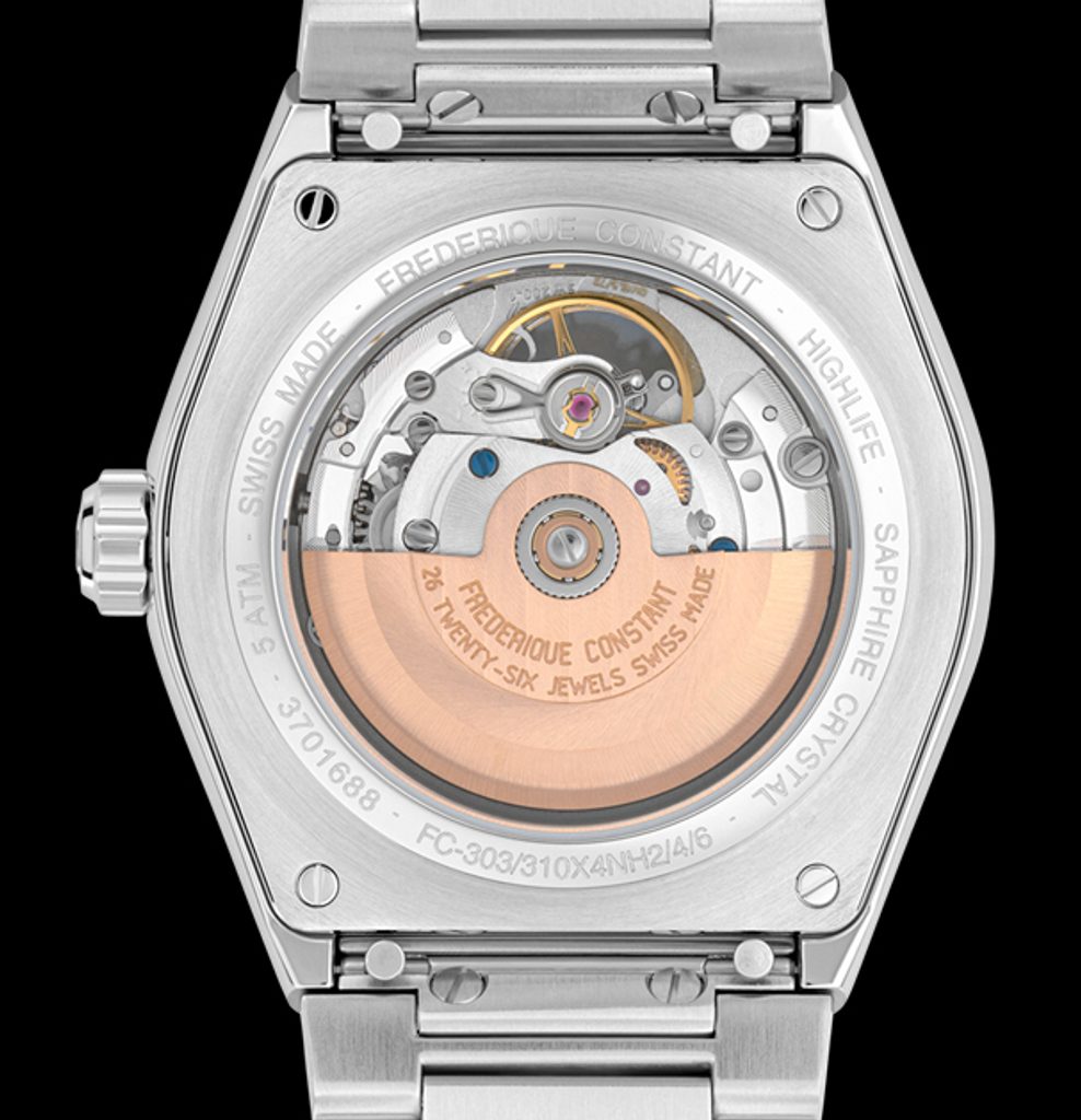 The Frederique Constant Highlife Gents Heart Beat Automatic FC-310S4NH6B is part of the Highlife line and its versatile design makes it suitable for everyday wear. However, it will also serve well as an accessory for company. The Highlife range is characterised by distinctive cases with integrated bracelets and straps. The Heart Beat design provides a clear view of the dial on the flywheel. This design has been typical of the Frederique Constant brand since its early days.