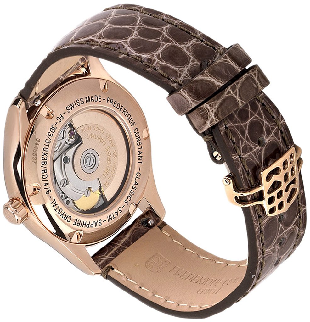 The case of the Frederique Constant FC-303LGD3B4 is made of stainless steel with a rose gold PVD finish and is complemented by a leather strap. Inside the case, the FC-303 Swiss mechanical movement (based on the Sellita SW200) with automatic winding works reliably. It operates at a frequency of 28,800 semi-frequencies per hour and features 26 jewels. At the position of the third hour we find a handy date indicator. The movement's operation can be observed through a transparent dial.