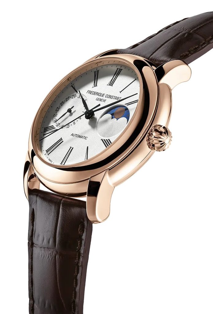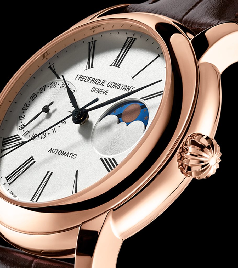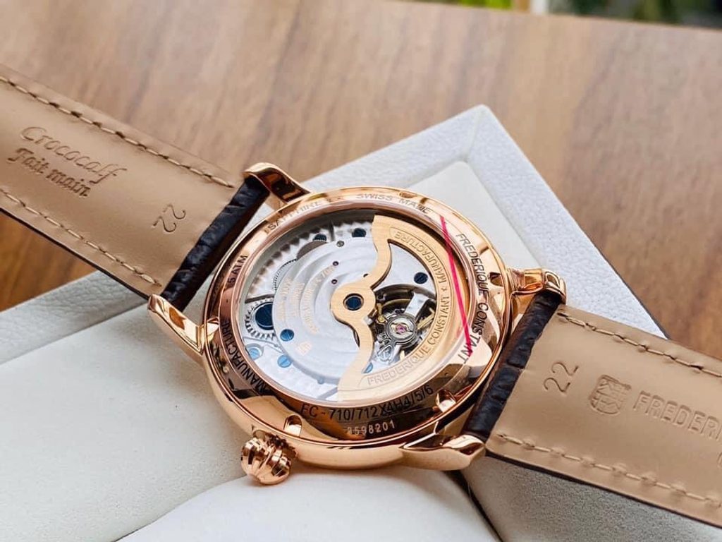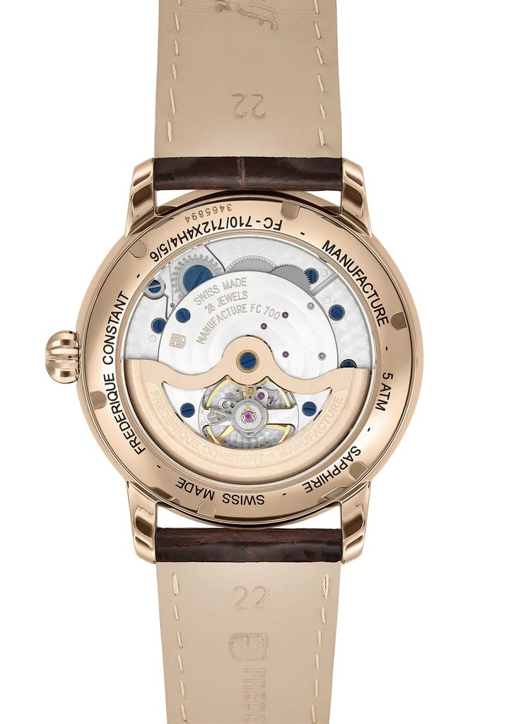 Developed by Frederique Constant in 2019, the FC-712 Manufacture movement operates at a frequency of 28,800 semi-frequencies per hour (4Hz), has 28 jewels and 150 components. The movement has an automatic winding with the option of manual crown winding and a hacking function, i.e. stopping the second hand when ordered. Its main advantages are the moon phase indicator function at the three o'clock position and the unconventional design of the date display in the sub-dial at the nine o'clock position. The power reserve is 38 hours. This is Frederique Constant's twenty-eighth in-house movement.
