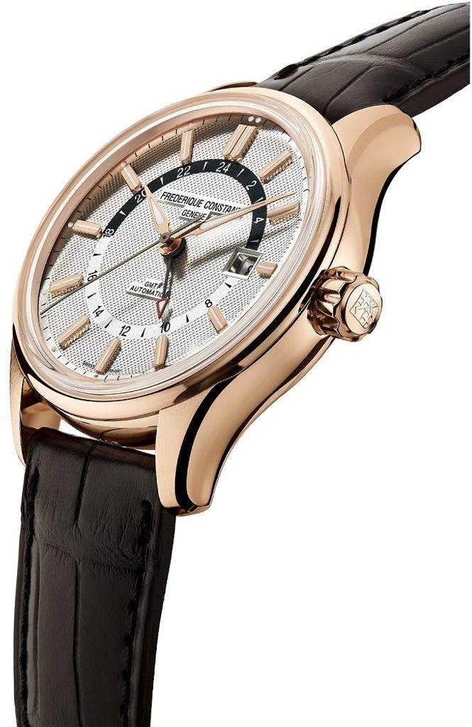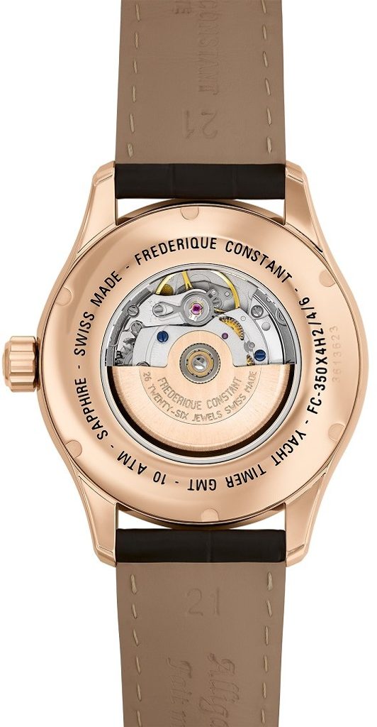The case of the Frederique Constant FC-350VT4H4 is made of stainless steel with a rose gold PVD finish and is complemented by a leather strap. Inside the case, the Swiss mechanical automatic movement FC-350 (the basis is the Sellita SW200) works reliably, which operates at a frequency of 28,800 semi-frequencies per hour. In addition, it is a so-called True GMT, where the GMT hand moves with the time setting and the adjustment of the main hour hand then takes place in leaps of one hour, while the home time on the GMT hand remains unchanged. At the 3 o'clock position we find a handy date indicator. The movement's operation can be observed thanks to the transparent dial.