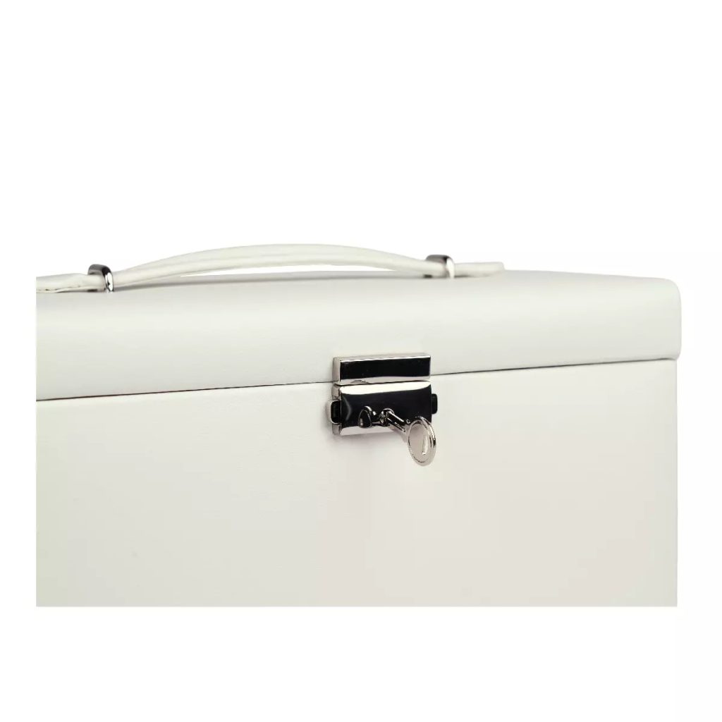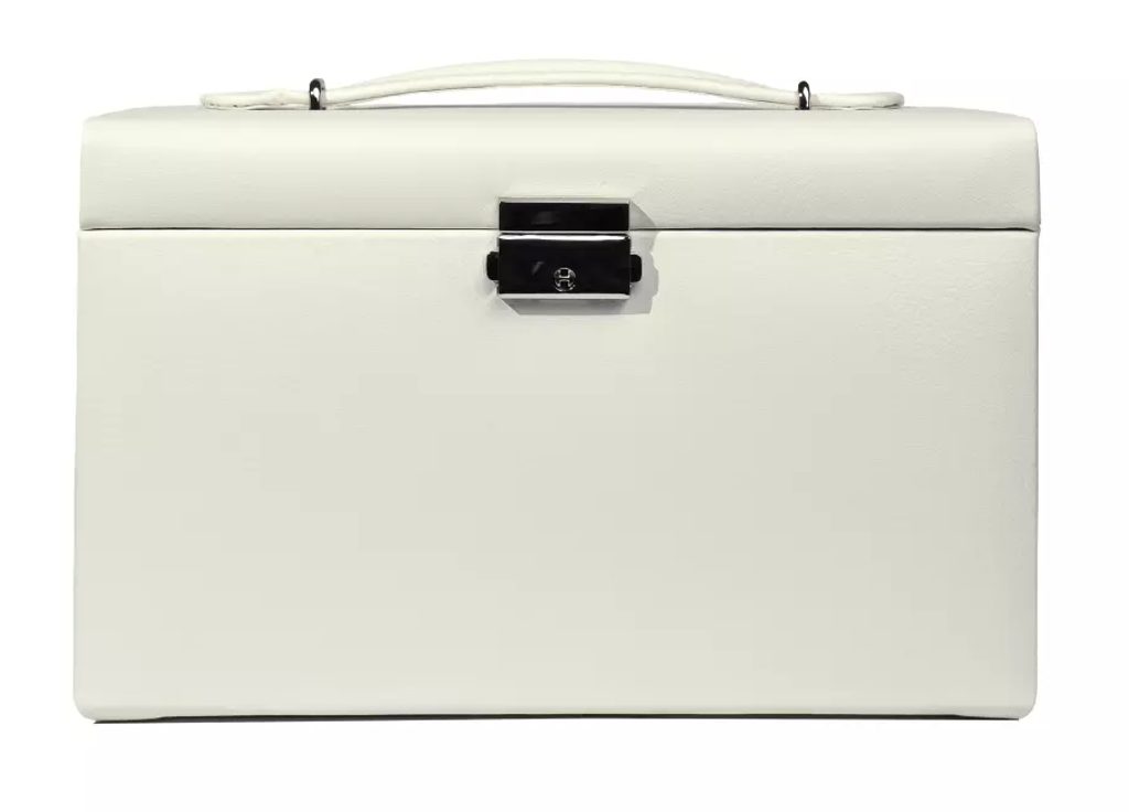 The Friedrich Lederwaren Classico Rosé jewellery box 23238-10 in cream is made of synthetic material. It contains several levels for storing different types of jewellery, a mirror and a strap for placing earrings can be found in the lid of the jewellery box.
