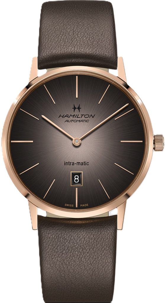 The warm accents and smoky elements of the new Hamilton Intra-Matic create a masculine American classic with a vintage look. The Intra-Matic draws on Hamilton's rich history for this watch, blending modern elements with original vintage details from the American Classic collection.