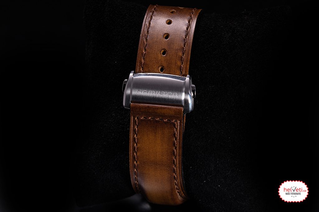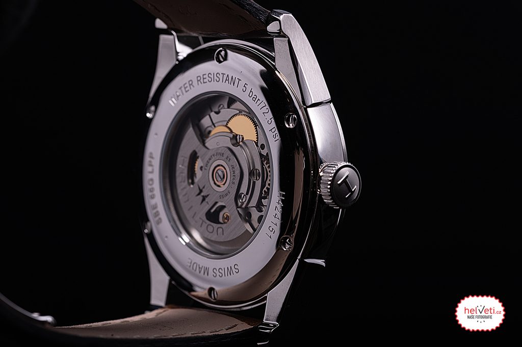 The case reliably ticks with the Hamilton H-10 Swiss mechanical movement (based on the ETA C07.611 built on the ETA 2824-2) with automatic winding. It operates at a frequency of 21,600 semi-frequencies per hour, has 25 jewels and, most importantly, an extended power reserve of 80 hours. The machine also has a"hacking" function (stopping the second hand when ordered) and the possibility of manual crown winding. In addition, the model has a handy date function at the 6 o'clock position.