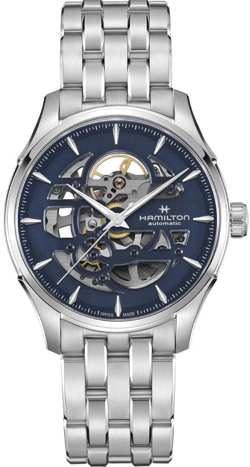 The Jazzmaster Skeleton models are all about precision and beauty. Hamilton's bold and distinctive design is integrated into the skeleton dial, revealing a glimpse of the highly crafted mechanical movement of this stunning and unique timepiece.