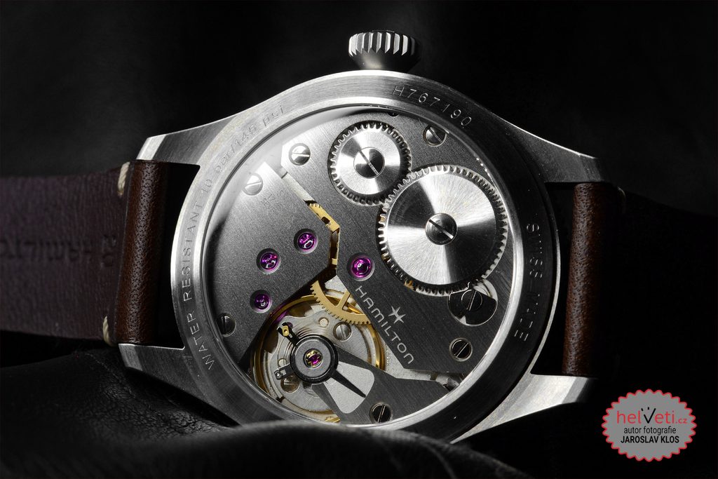 The ETA 6498-1 Swiss mechanical movement with manual winding ticks reliably in the case. It operates at a frequency of 18,000 semi-frequencies per hour and features 17 jewels and, most importantly, a power reserve of 46 hours. The movement's operation can be observed through a transparent dial.