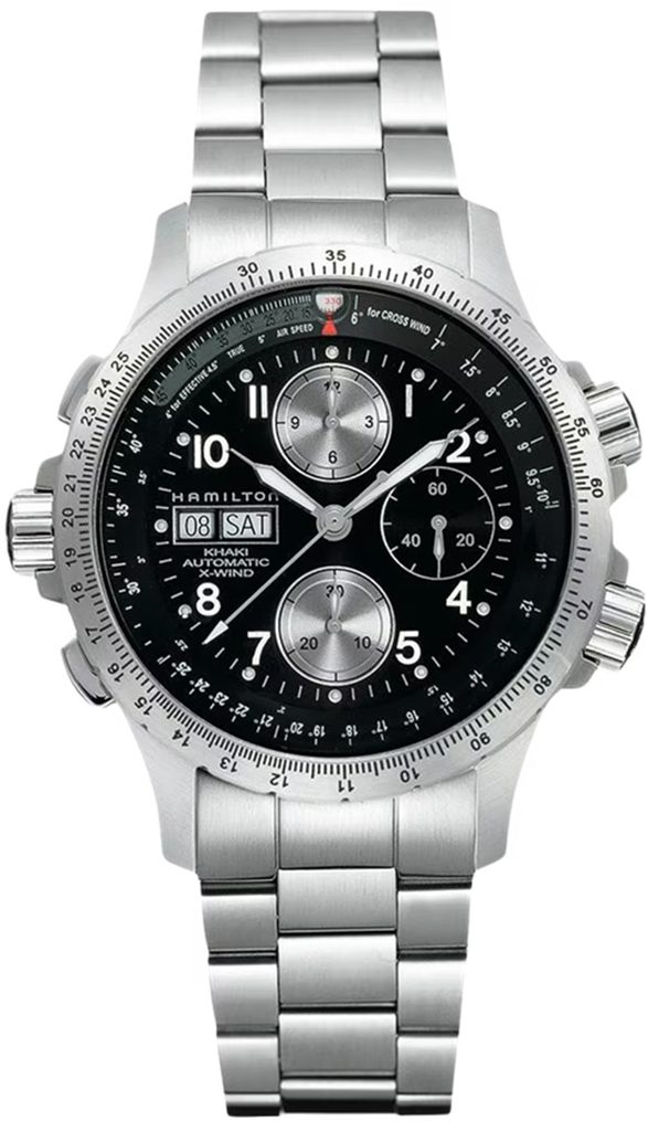 The Hamilton Khaki Aviation X-Wind Auto Chrono H77616133 will particularly appeal to aviation style enthusiasts. The Khaki Aviation collection is designed with pilots in mind and built for a life of adventure.