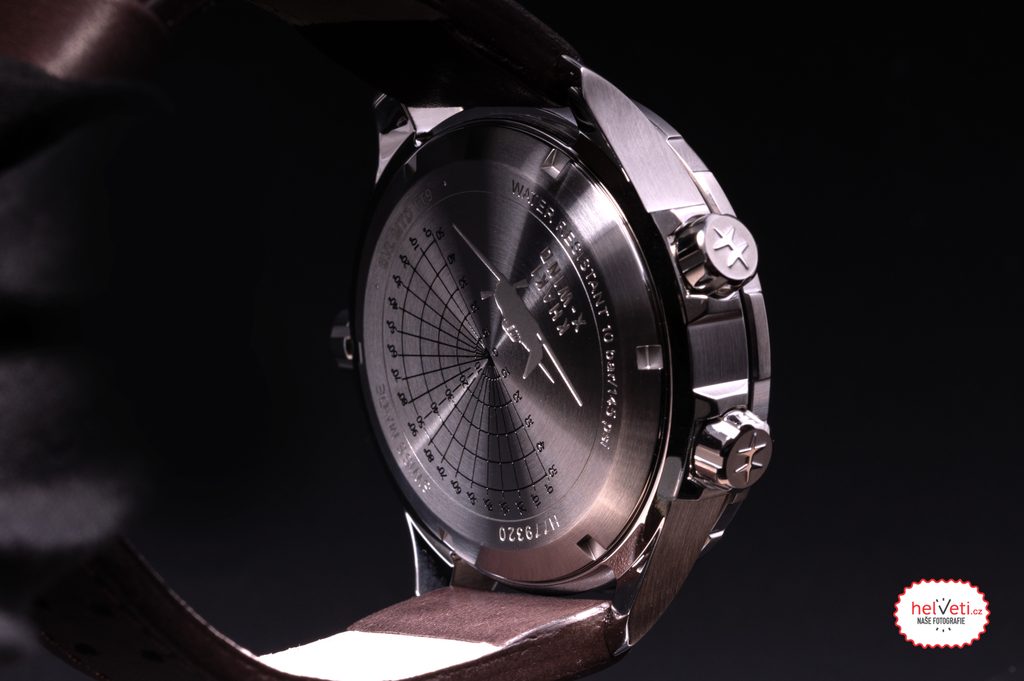 The 46 mm case diameter makes the model one of the larger men's watches. The water resistance of the watch is 100 m (10 ATM), so it can handle even greater contact with water, such as swimming. The water resistance is supported by a screw-down crown.