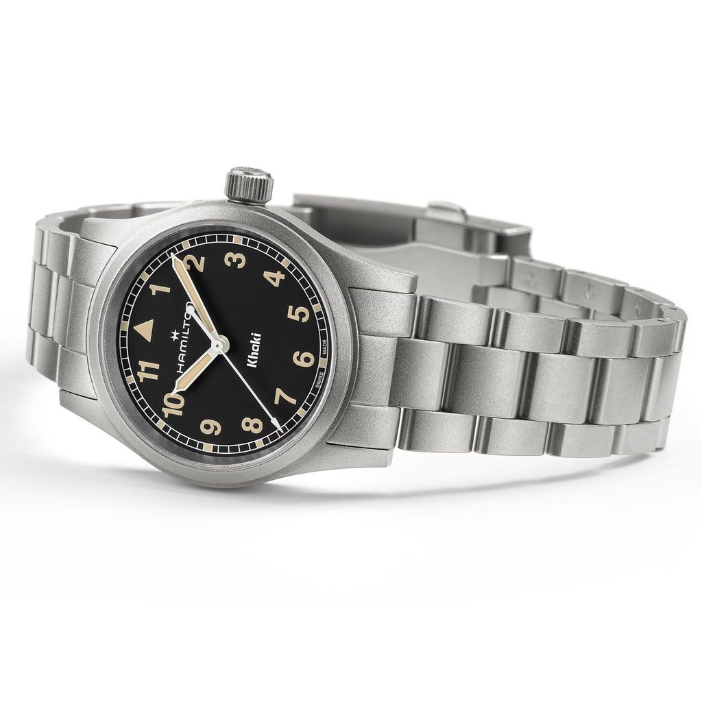 Ready for adventure, the Khaki Field Quartz models are a reliable and durable companion ready for exploration. A mix of precision, innovation and utility-focused design, Khaki Field Quartz combines a 33mm pure black dial with a modern metal bracelet.