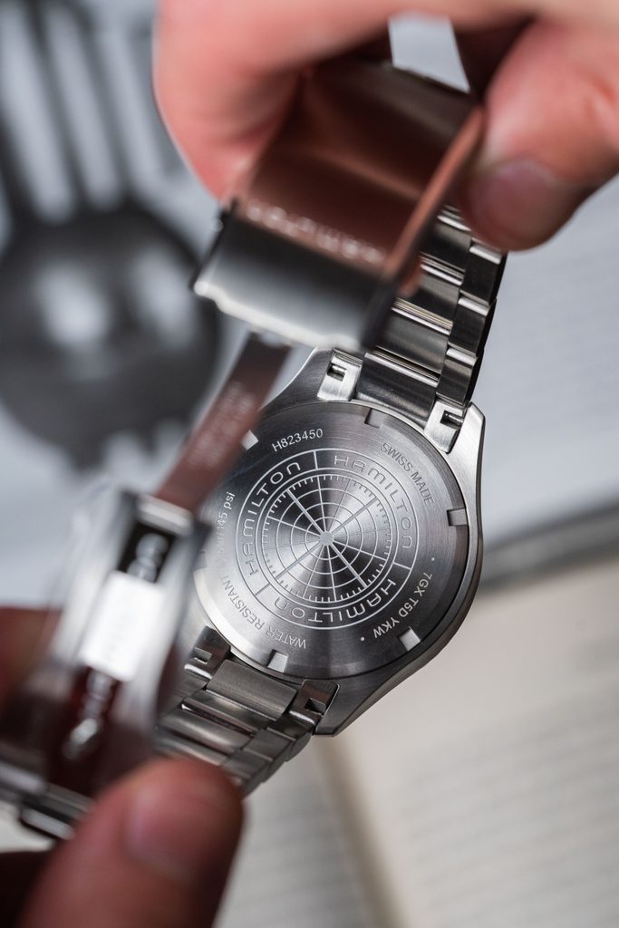 Inside the case, the Hamilton H-10 Swiss mechanical movement (based on the ETA C07.611 built on the ETA 2824-2) ticks reliably with automatic winding. It operates at a frequency of 21,600 semi-frequencies per hour, has 25 jewels and, most importantly, an extended power reserve of 80 hours. The machine also has a"hacking" function (stopping the second hand when ordered) and the possibility of manual crown winding.
