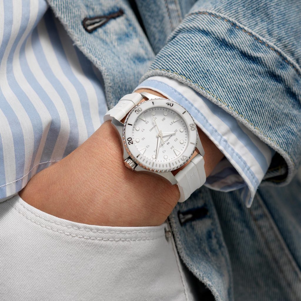 A ceramic lunette with precisely engraved numerals adds style to the Hamilton Khaki Navy Scuba Quartz H82231150 and protects it from corrosive elements like sand and salt water when at sea. The watch has a smaller case, at 37mm, water resistance of 10 ATM (100m) and an extra legible dial. It's a high-performance watch ready for all your adventures on the water, in the water and underwater. It's also the perfect summer accessory.