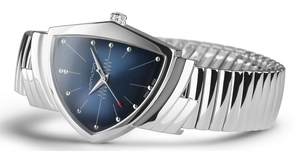 Launched in 1957, the original Ventura made watchmaking history as the world's first battery-powered electric watch. With its bold and distinctive design, the model quickly became an icon and a collector's item. The latest incarnation of the Ventura is a faithful homage to the original and reflects the pioneering celebration of mid-century modern shield-shaped design.
