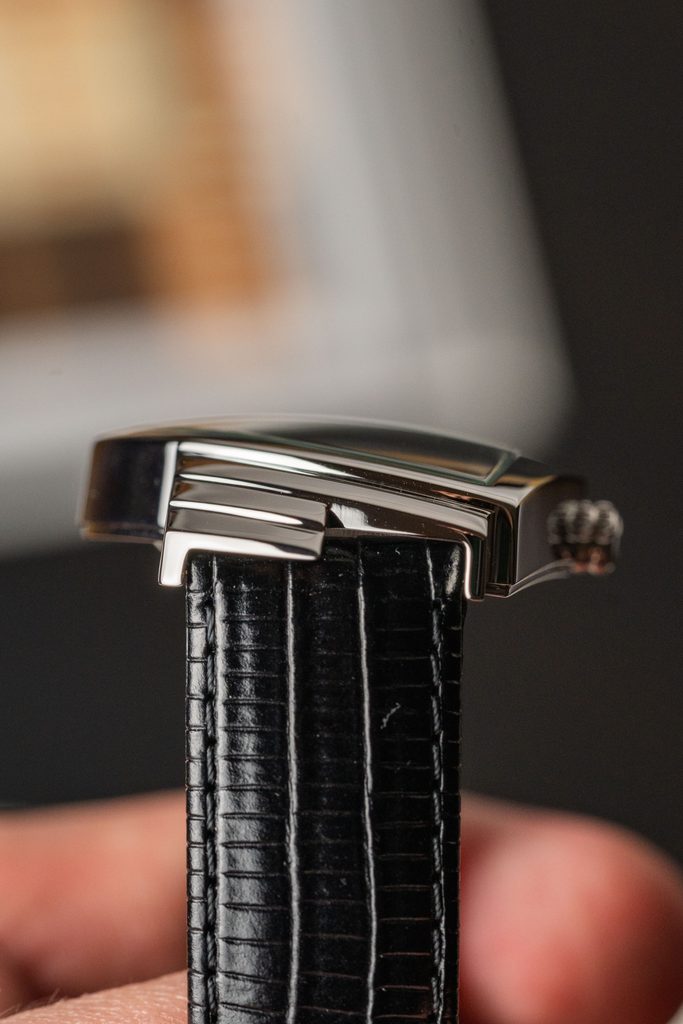 The watch is powered by a Swiss quartz movement ETA F05.111. The steel shield-shaped case, designed by Richard Arbib for Hamilton in 1957, is the unmistakable and main feature. The rich black dial is contrasted by the central electro-curve running between the dot indices 3 and 9.